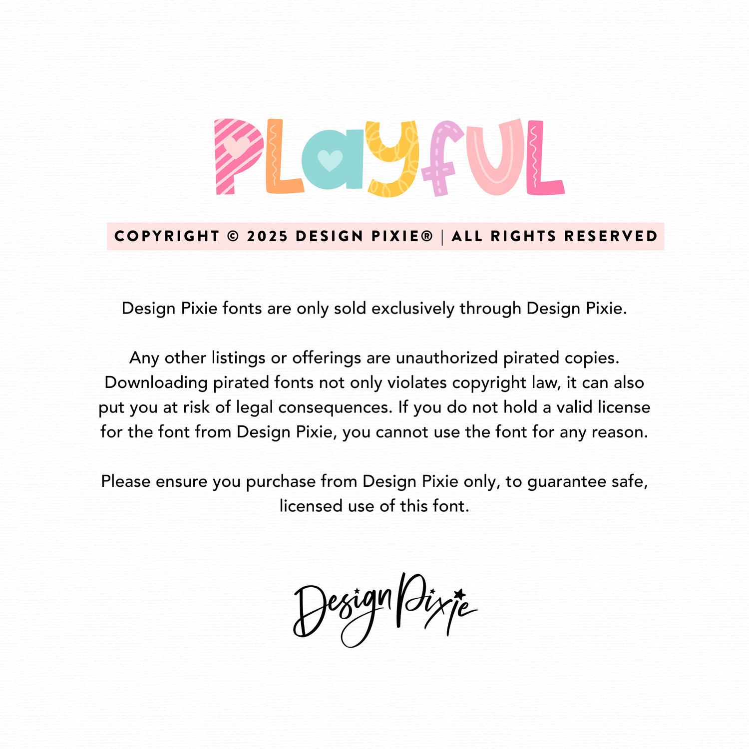 The Playful font is our intellectual property and is protected by international copyright law. You must purchase the font from Design Pixie to hold a valid license to use the font.