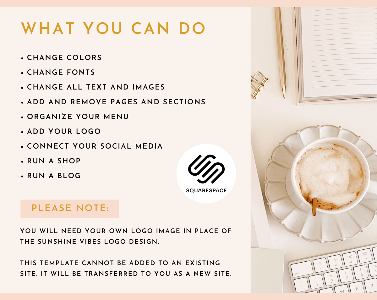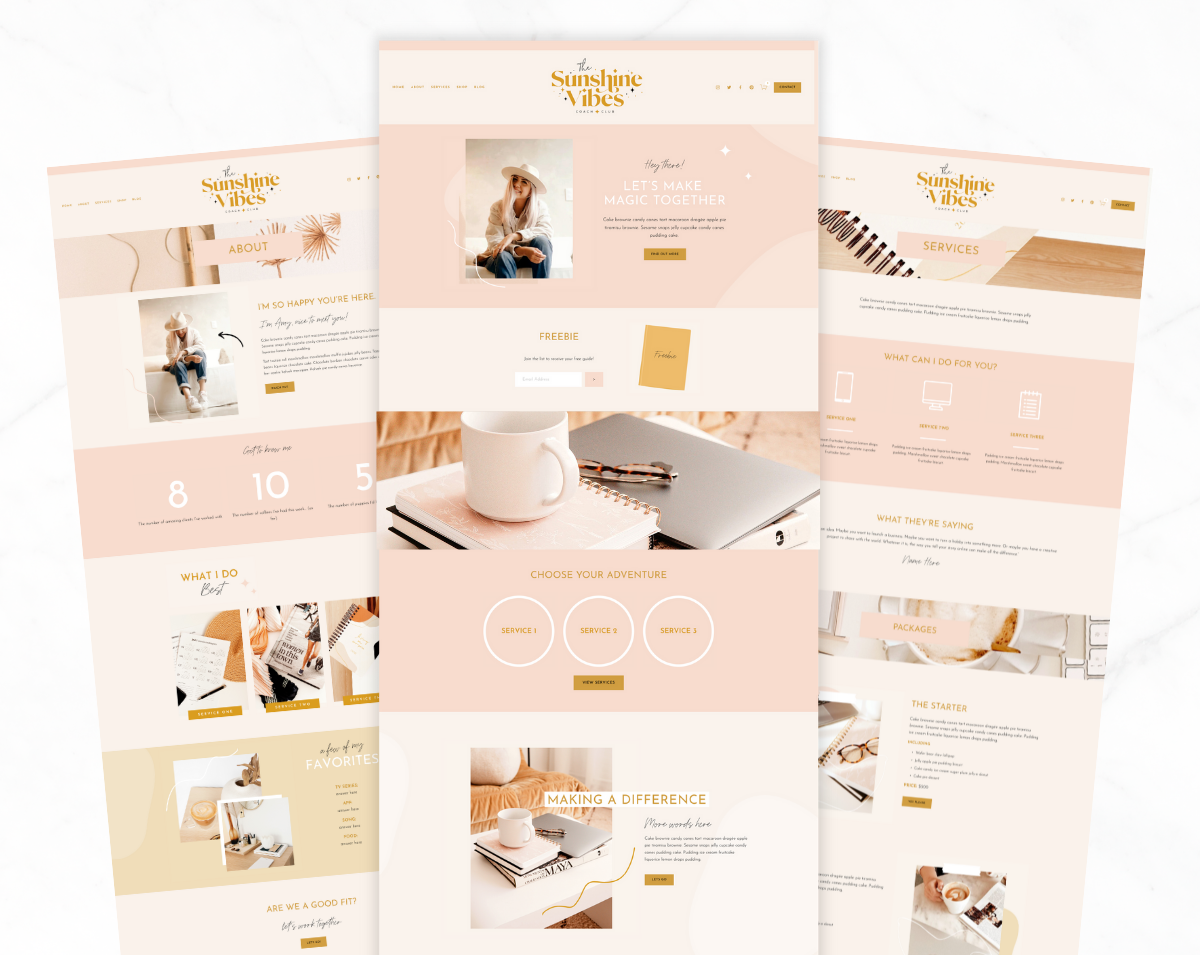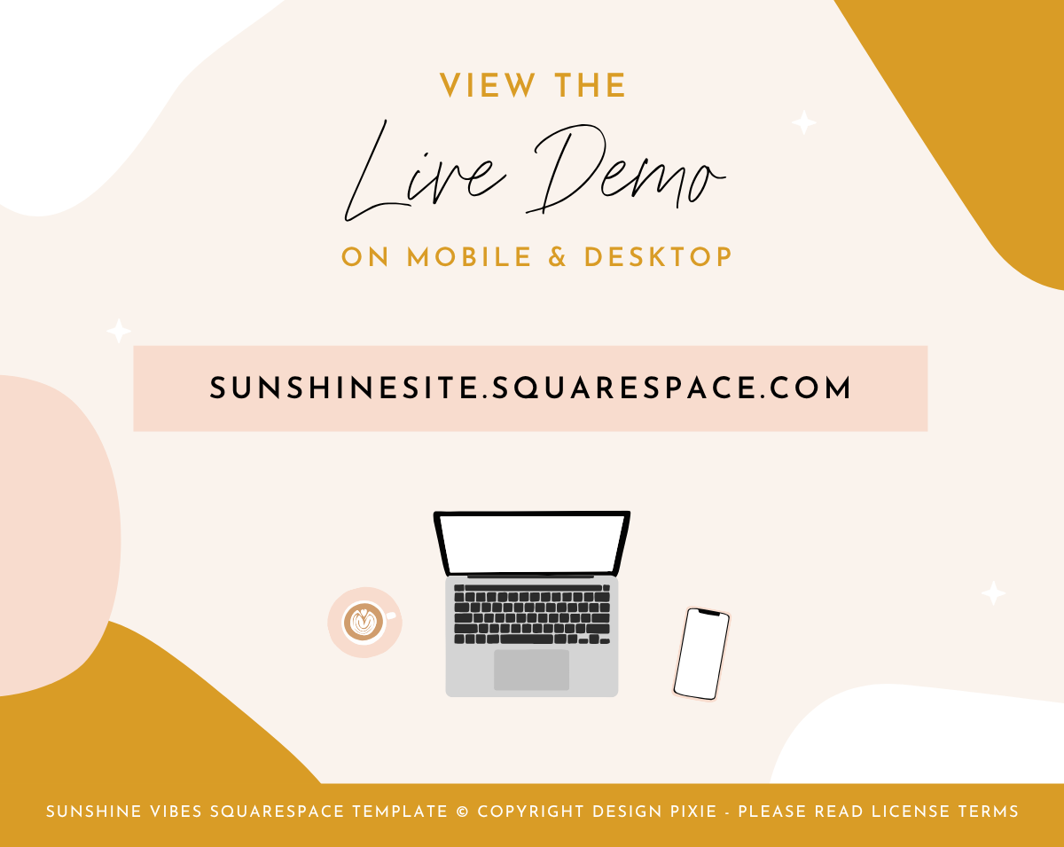 Squarespace Website Template in the Sunshine Vibes design. Perfect for any blogger, influencer, small business owner, social media manager, podcast, online coach or entrepreneur, easily edit the template to suit you.