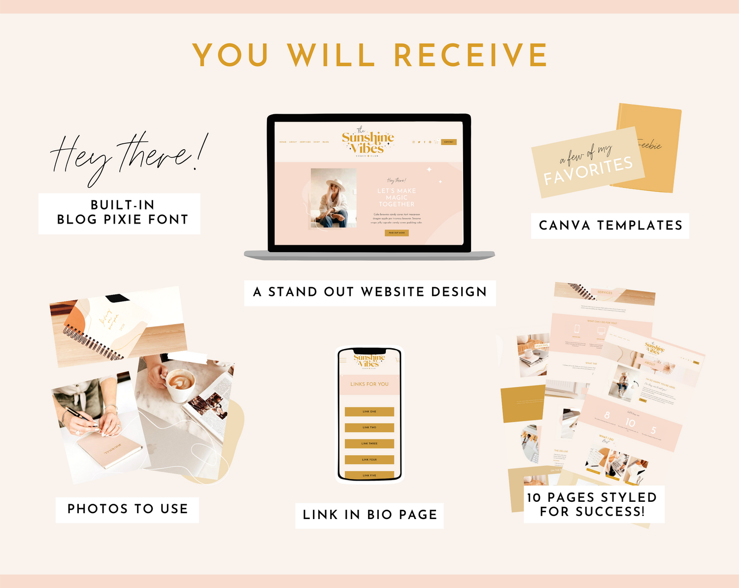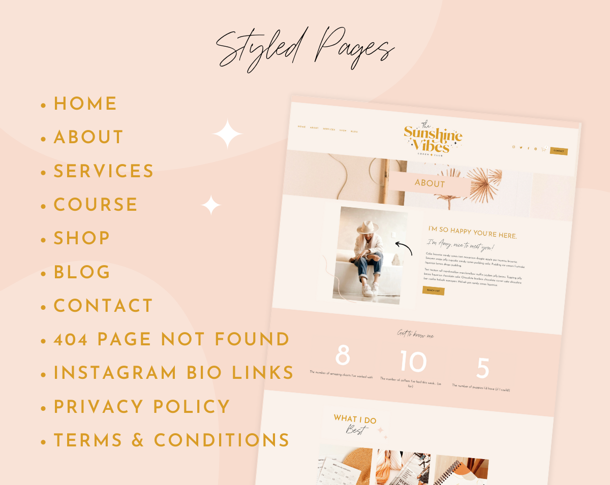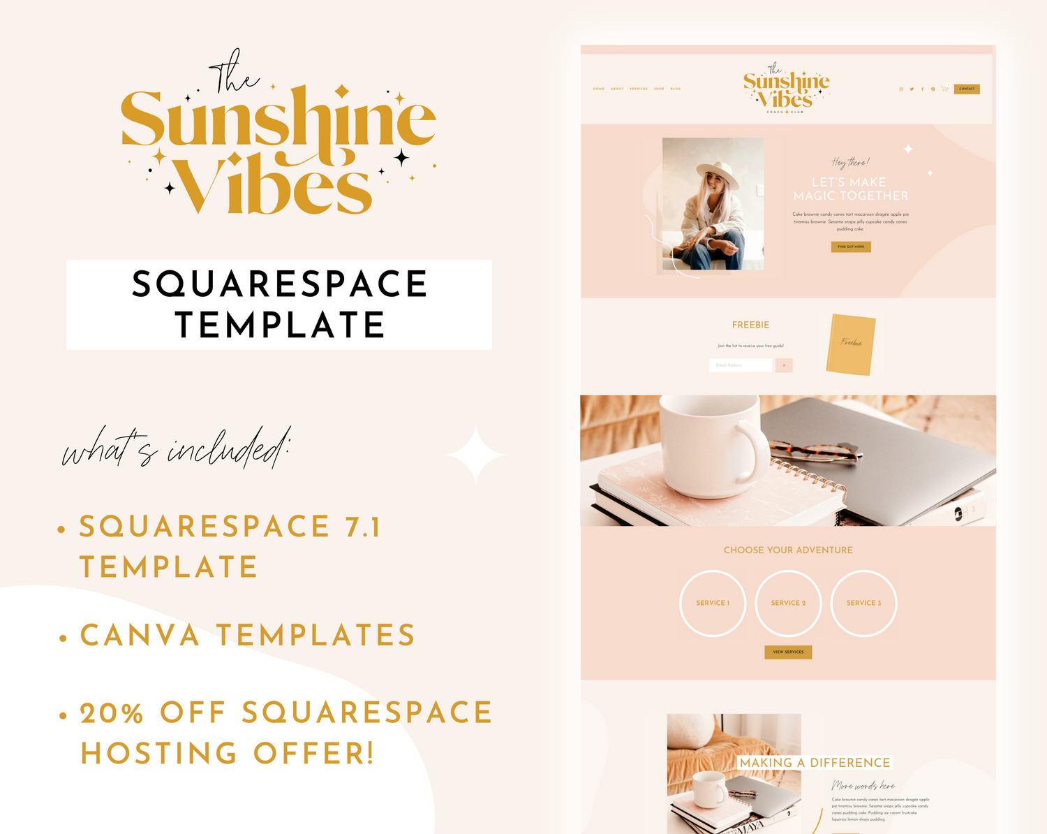 Squarespace Website Template in the Sunshine Vibes design. Perfect for any blogger, influencer, small business owner, social media manager, podcast, online coach or entrepreneur, easily edit the template to suit you.