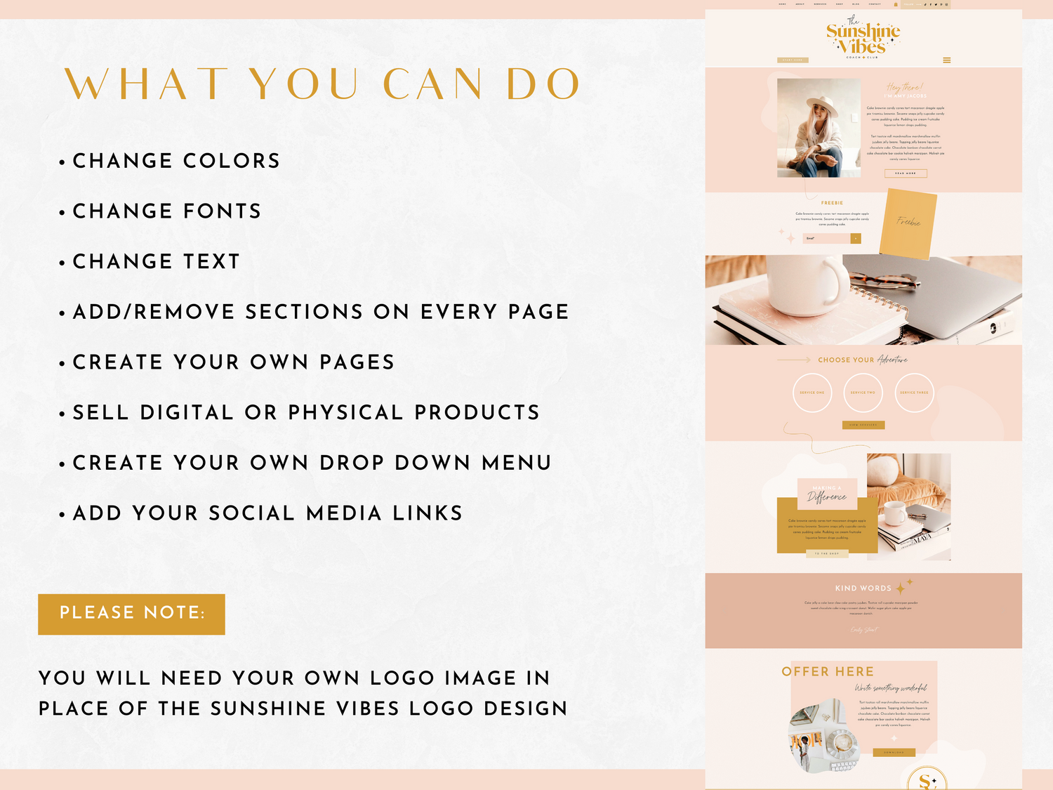 Fully customizable, the Sunshine Vibes template allows you to easily adjust every element to match your brand’s sunny personality, from fonts and colors to images and sections.