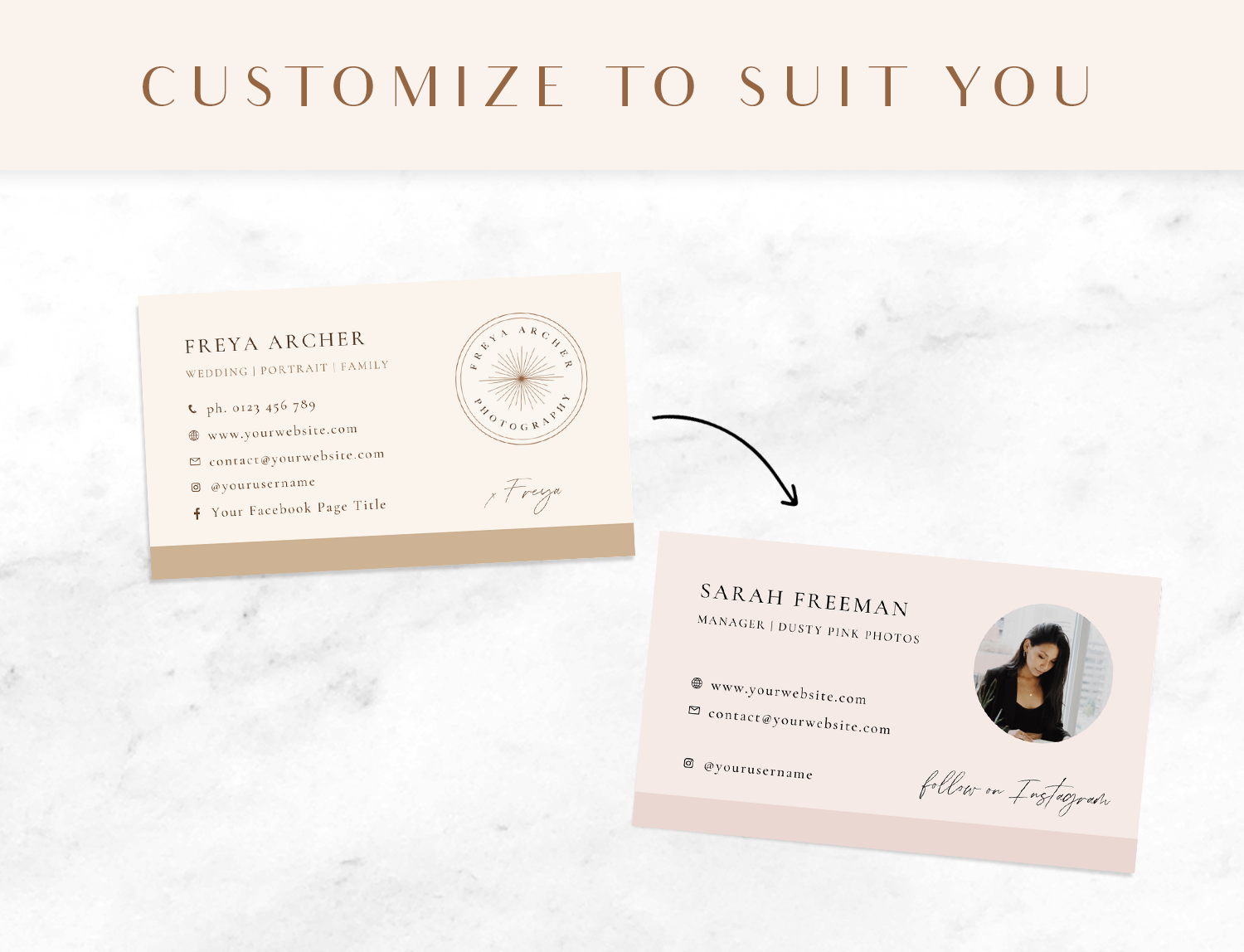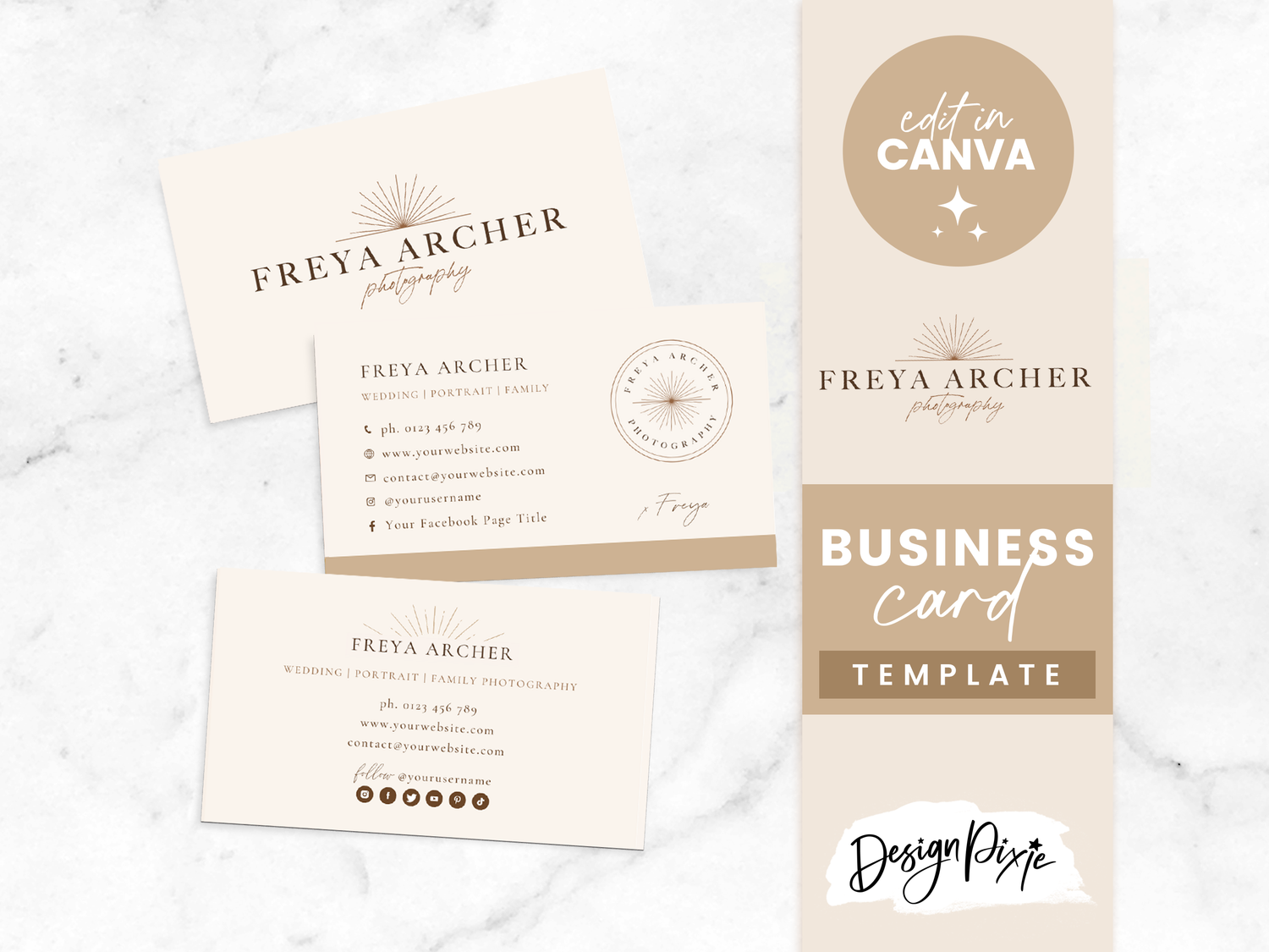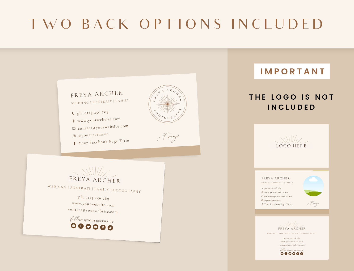 Photographer business card template in a beige boho design to edit in Canva! Brand your photography business with a modern, editable business card template design. Customize all the colors, text and images to suit you and your business.