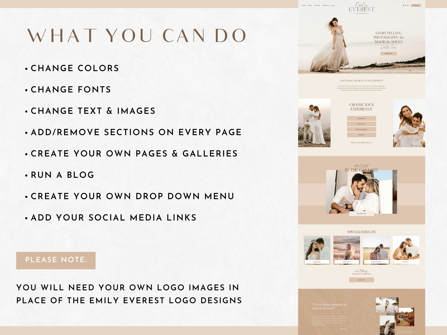 Create a breathtaking online portfolio with the Emily Everest Wix Template for Photographers. Designed with displaying photos in mind, this stunning beige-toned template is the perfect canvas for showcasing your best work. Whether you specialize in wedding photography, engagements, family portraits, or lifestyle photography, this elegant design will let your photos shine with sophistication and style.