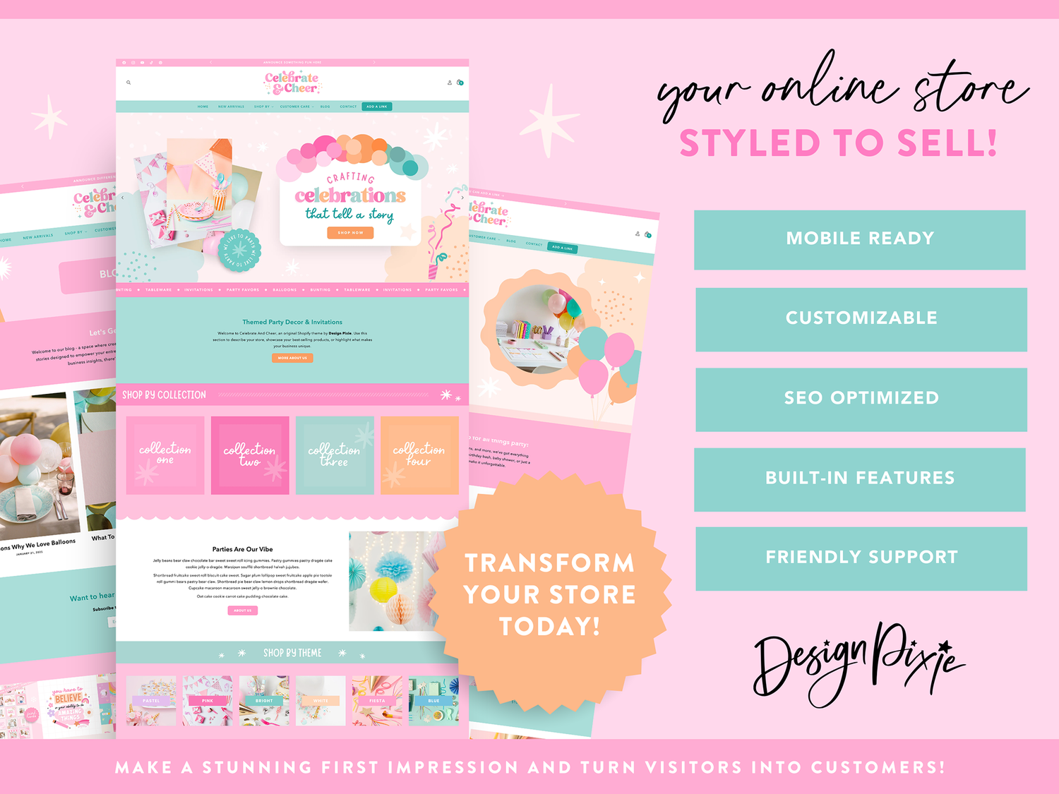 Bring the fun to your online store with this bright party Shopify theme, designed for party supply shops, balloon businesses, printable invitations and event stylists. With bold colors, confetti, streamers, stars, and bunting, this theme instantly creates a festive and joyful shopping experience!
