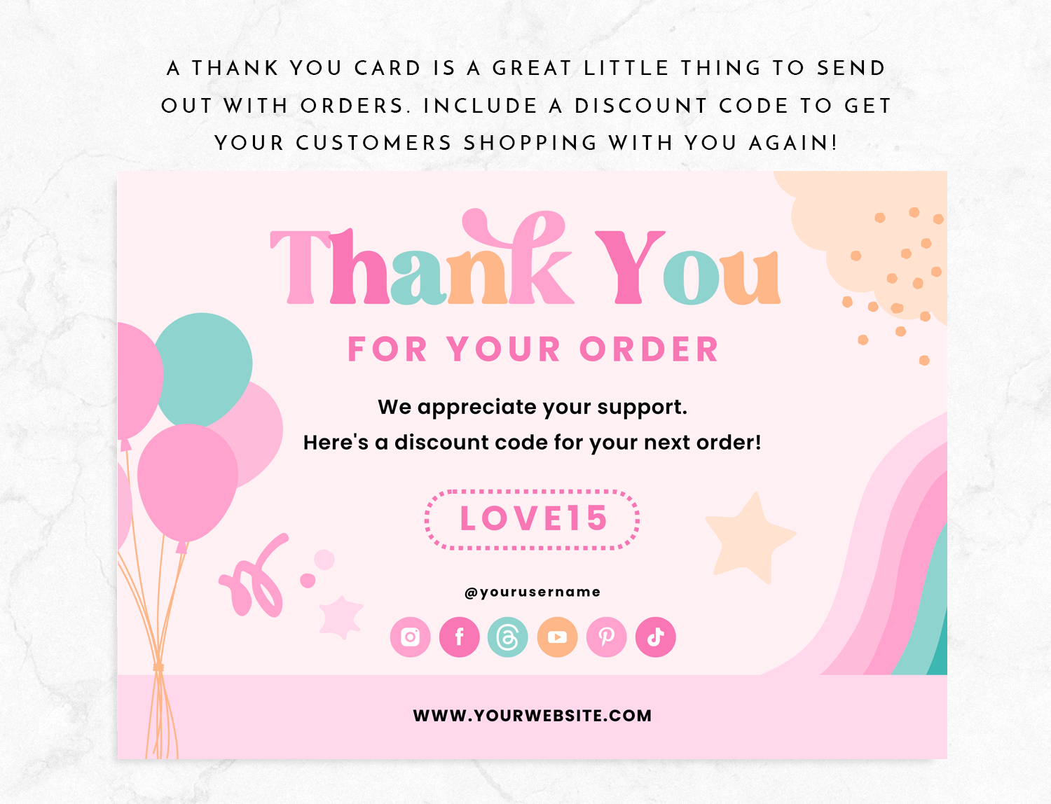 Add a pop of color to your packaging with our Bright Party Thank You Card Template! This bold and cheerful design is perfect for party business owners who want to leave a lasting impression. Easily editable in Canva, you can customize the text, colors, and fonts to match your brand and show your customers some love with a fun, vibrant thank-you note!