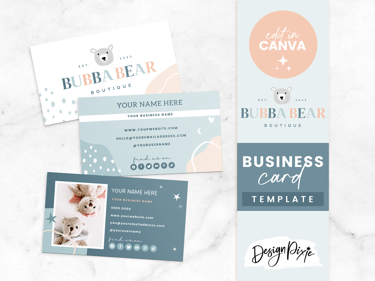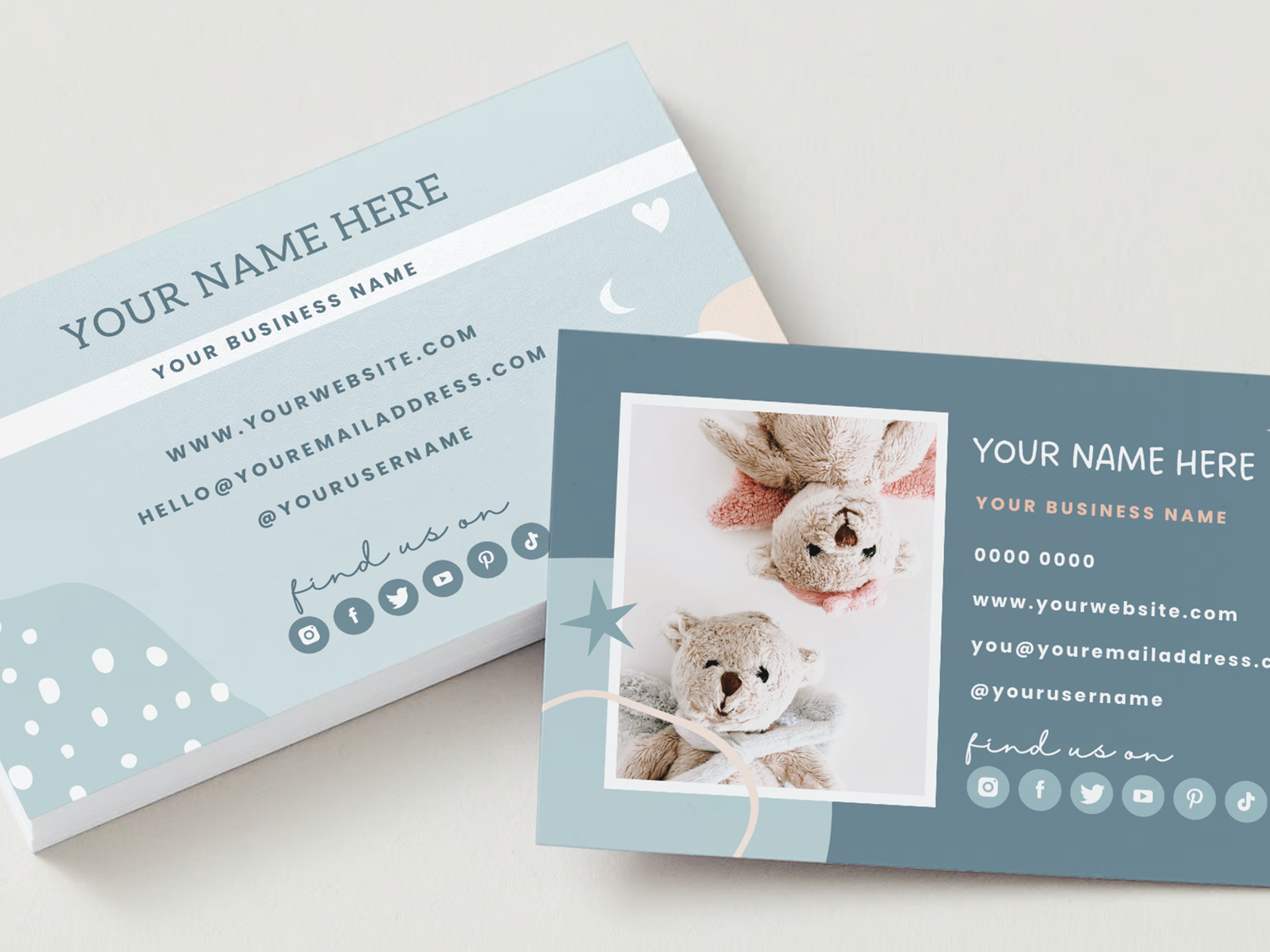 Baby blue business card template in a cute design to edit in Canva! Brand your small business with a cute and colorful editable business card template design. Customize all the colors, text and images to suit you and your business.