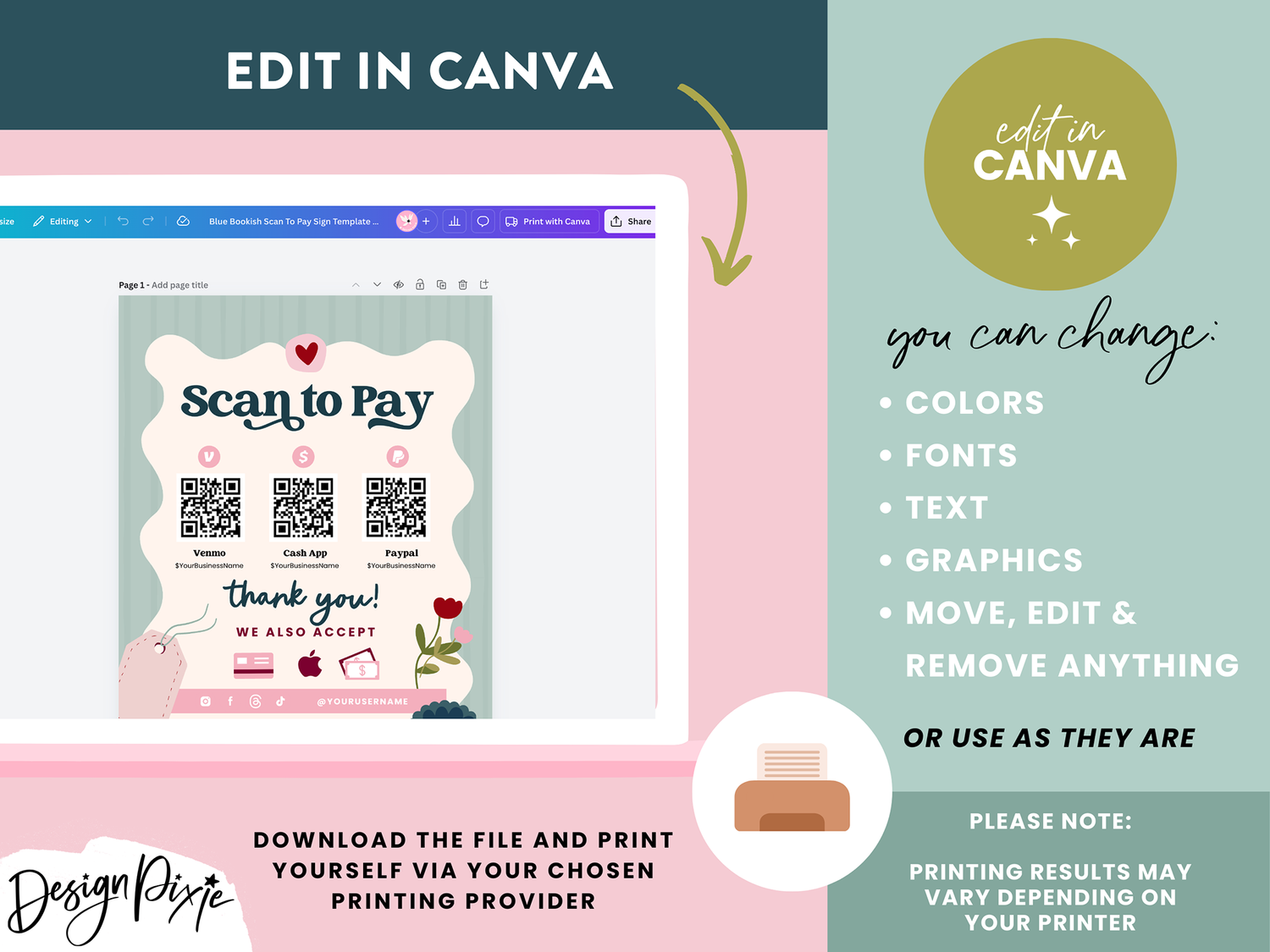 The design is easy to edit in Canva, allowing you to adjust the text, colors, and fonts to match your brand’s aesthetic. Print and frame it for your checkout counter to create a seamless and beautiful payment experience for your customers!