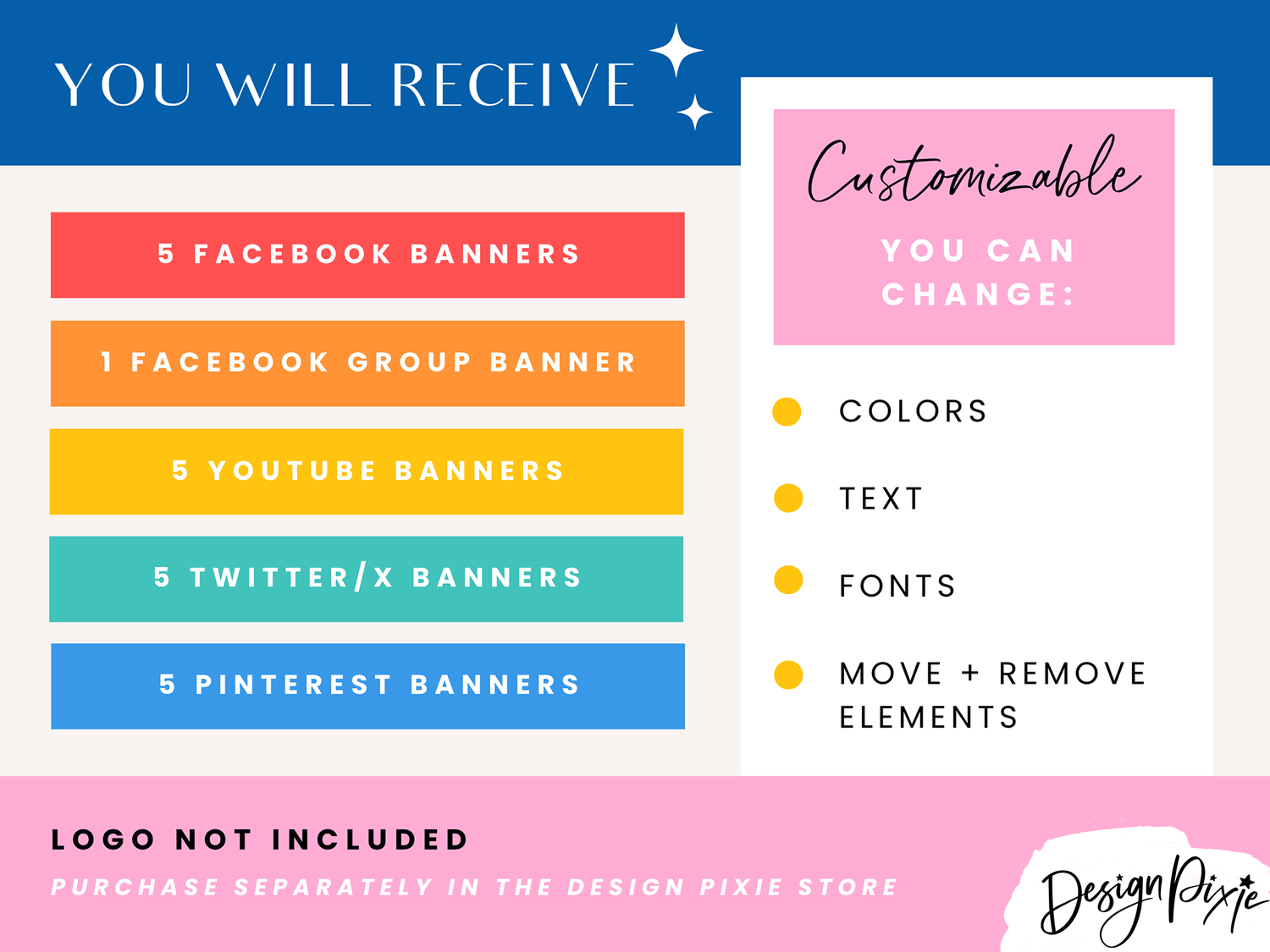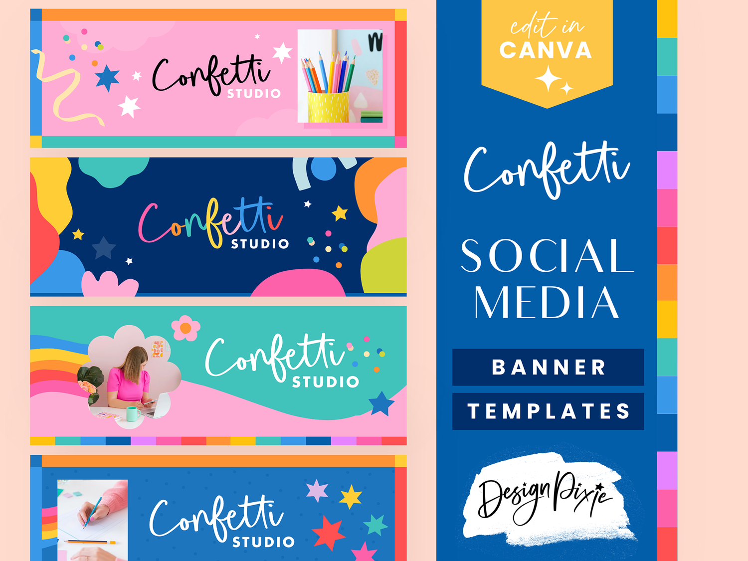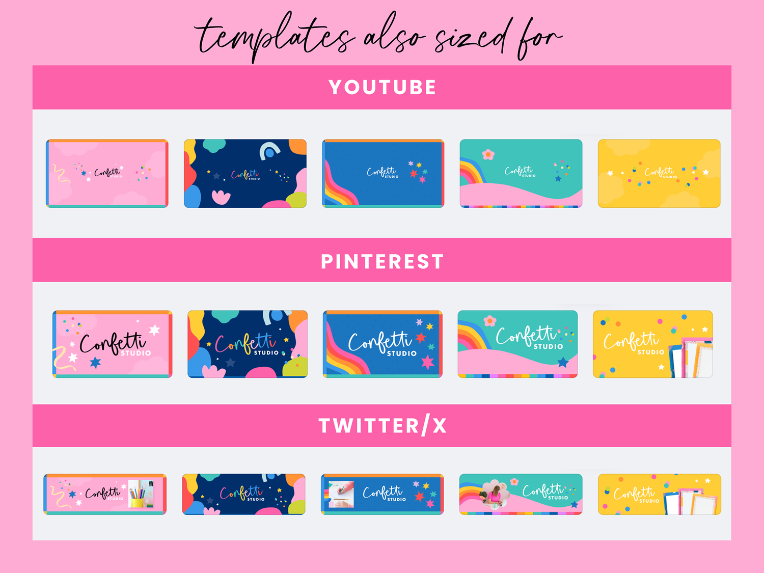 Give your social media profiles a bold new look with this Confetti Social Media Banner Pack! Designed in fun rainbow and primary colors, this collection includes 21 editable Canva templates for all your favorite platforms - Facebook, Twitter (X), Pinterest, and YouTube.