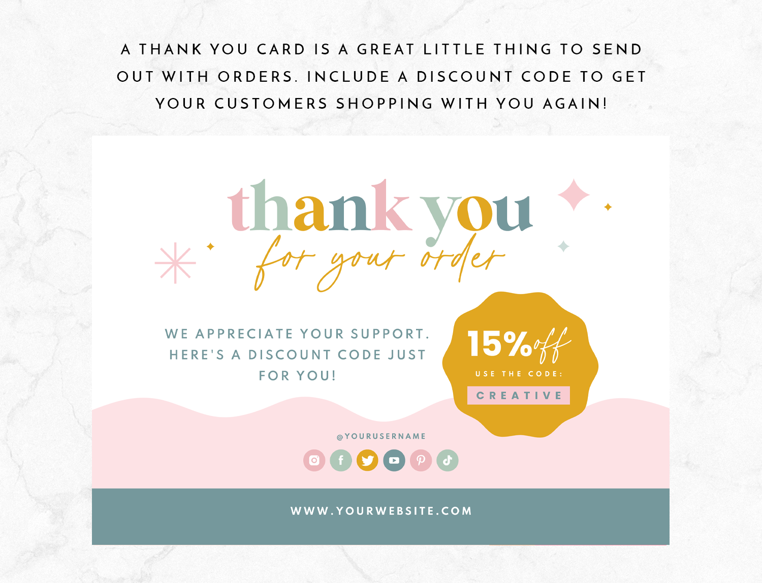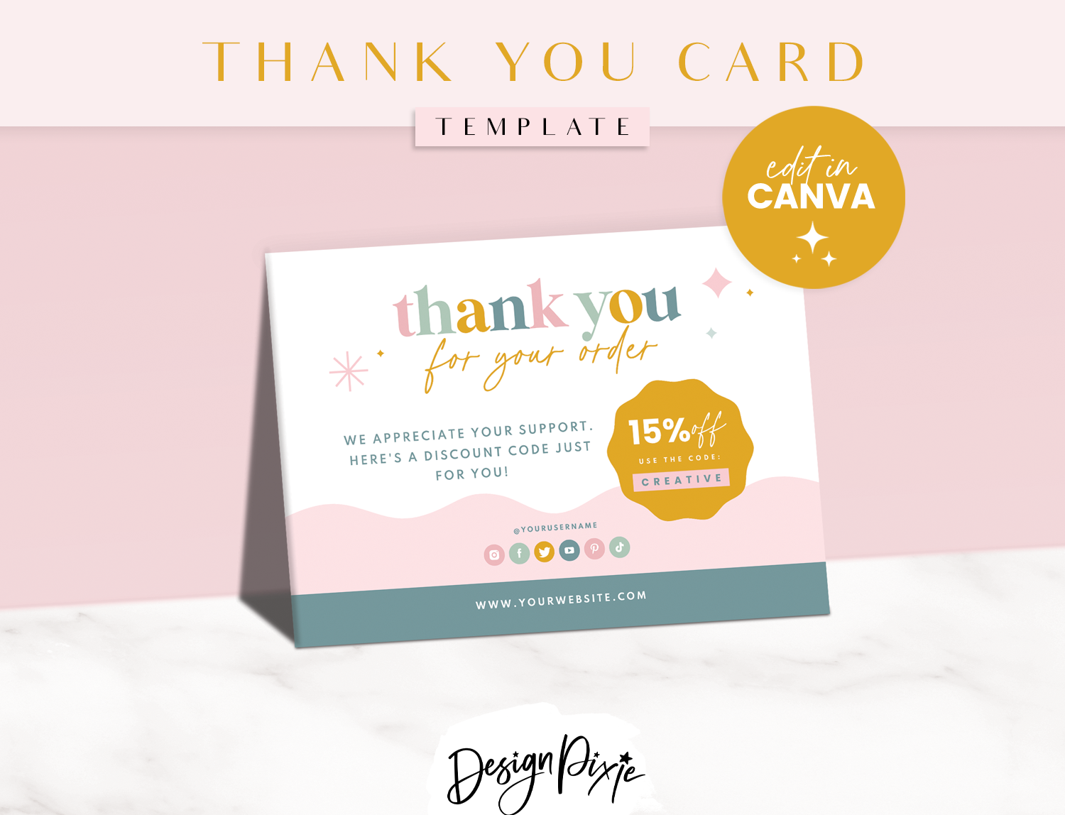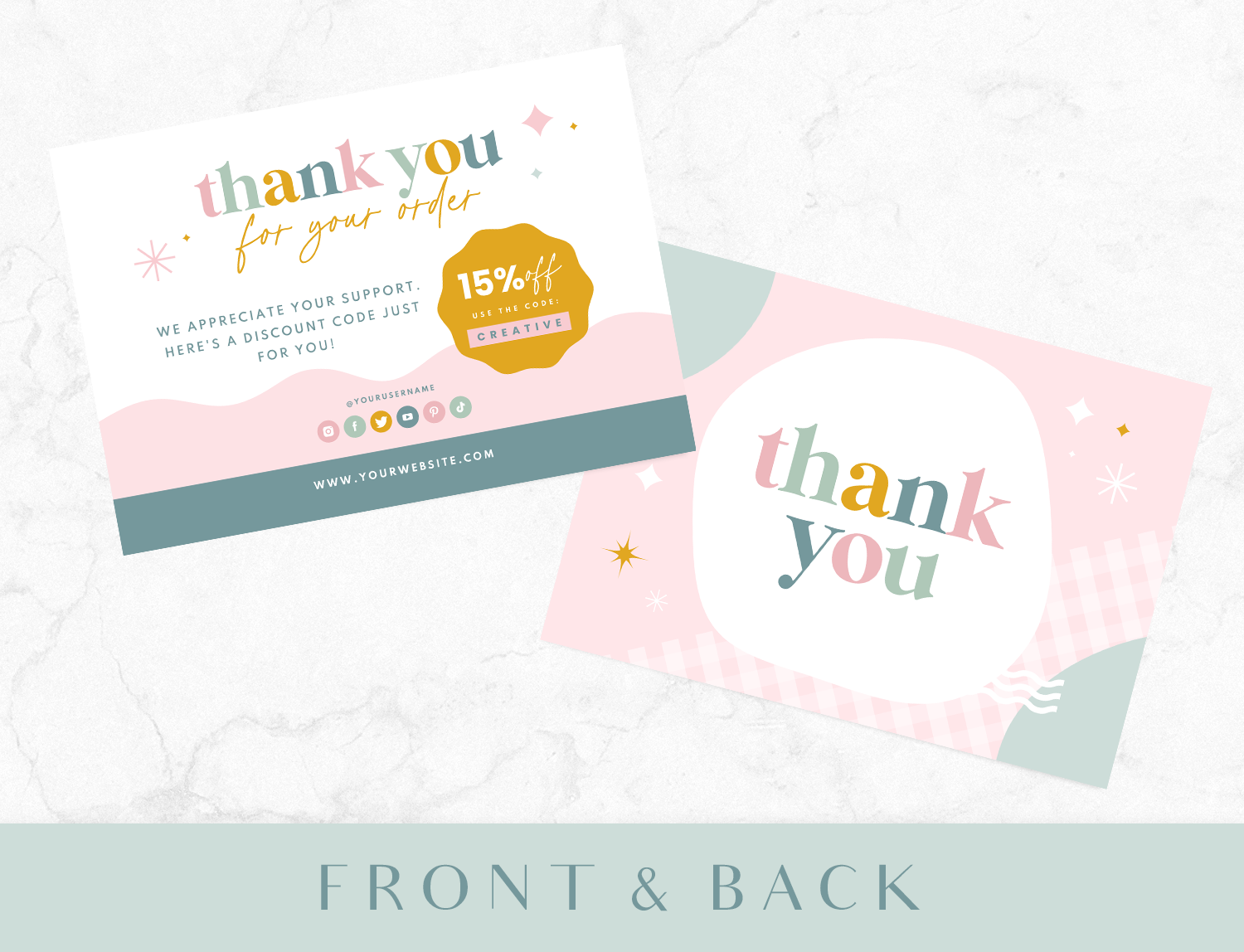 Pastel Thank You Card template to edit in Canva in a cute and colorful pastel rainbow design! Brand your small business with colorful Thank You cards that you can print and send out with orders.
