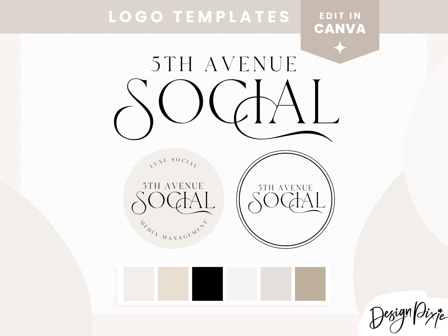 Create a stand-out brand with the 5th Avenue Social logo template to edit in Canva. This minimal luxe logo template features a premium font with tails, so you can create swirls on characters for a designer look.