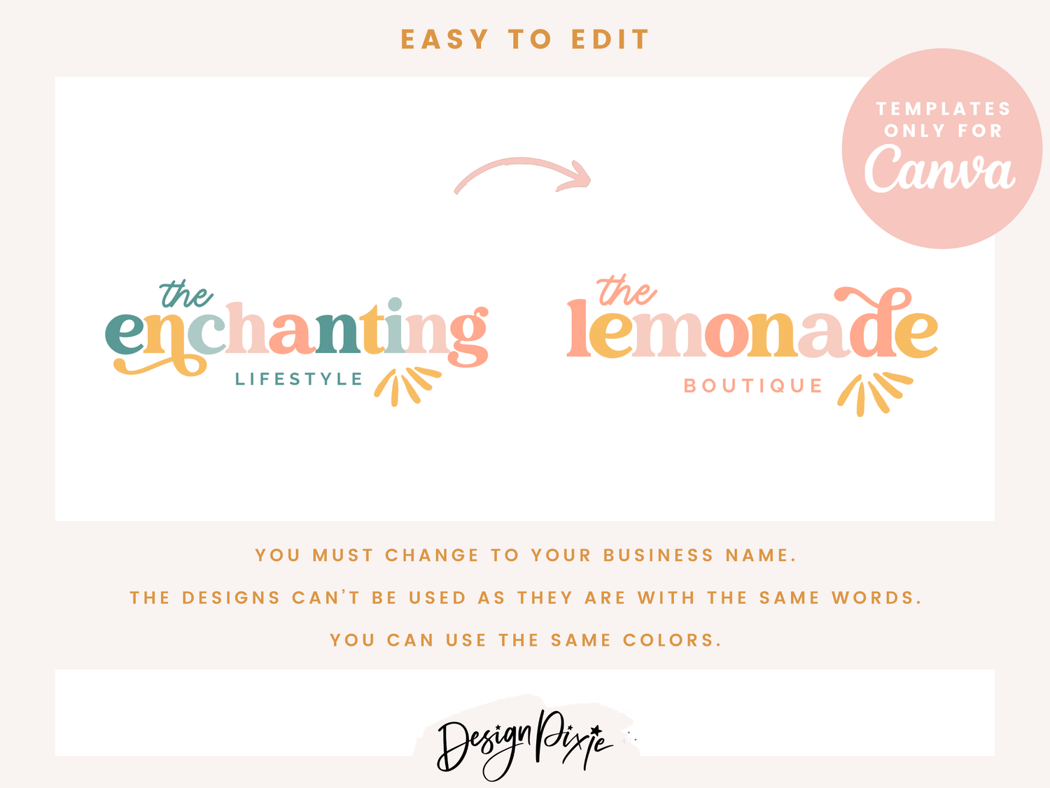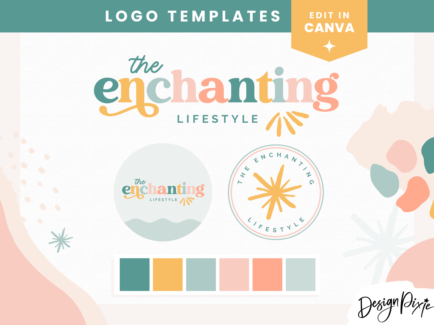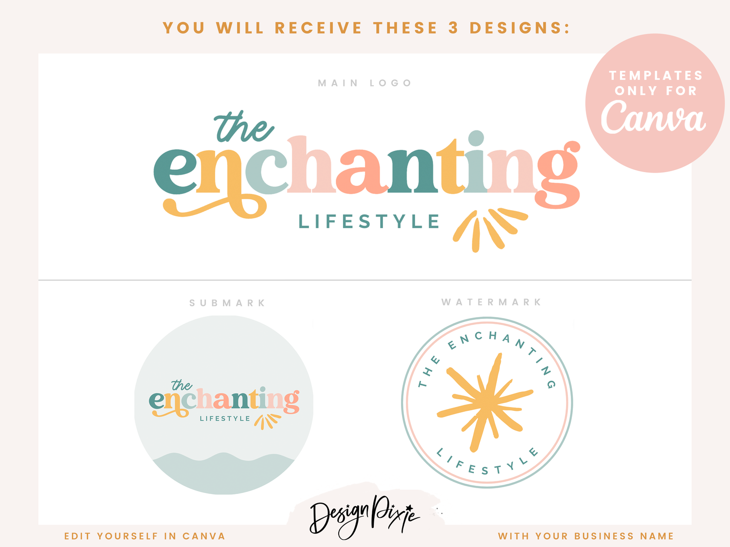 Enchanting logo template to edit yourself in Canva. This pastel colorful logo is an editable logo design for Canva. Edit your own custom logo with your own business name using these logo templates by Design Pixie.