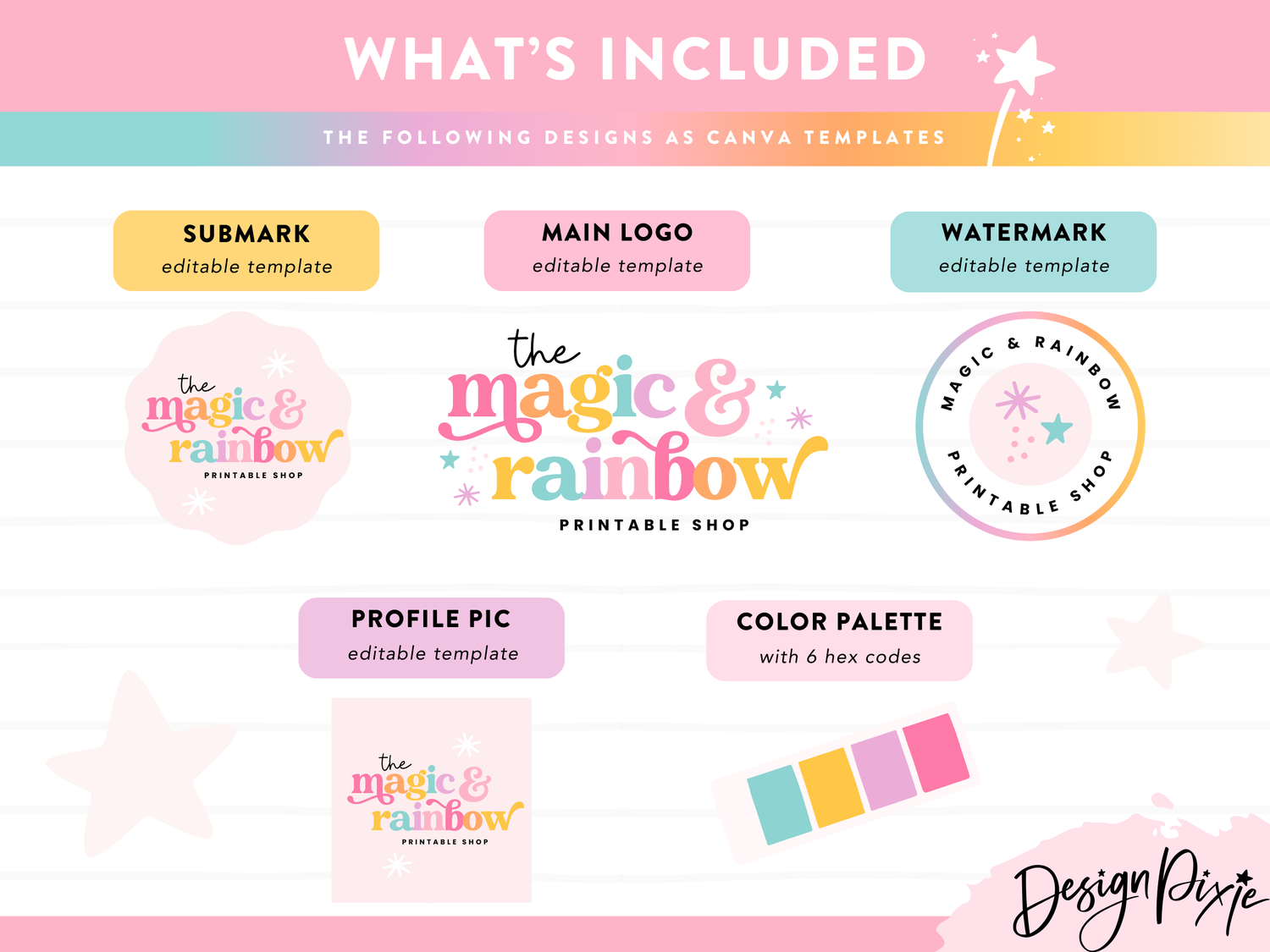 The Magic & Rainbow logo includes a bold retro font with swirls, rainbow colors and stars. A great logo for printable shops, digital products, fun boutiques or a playful small business.