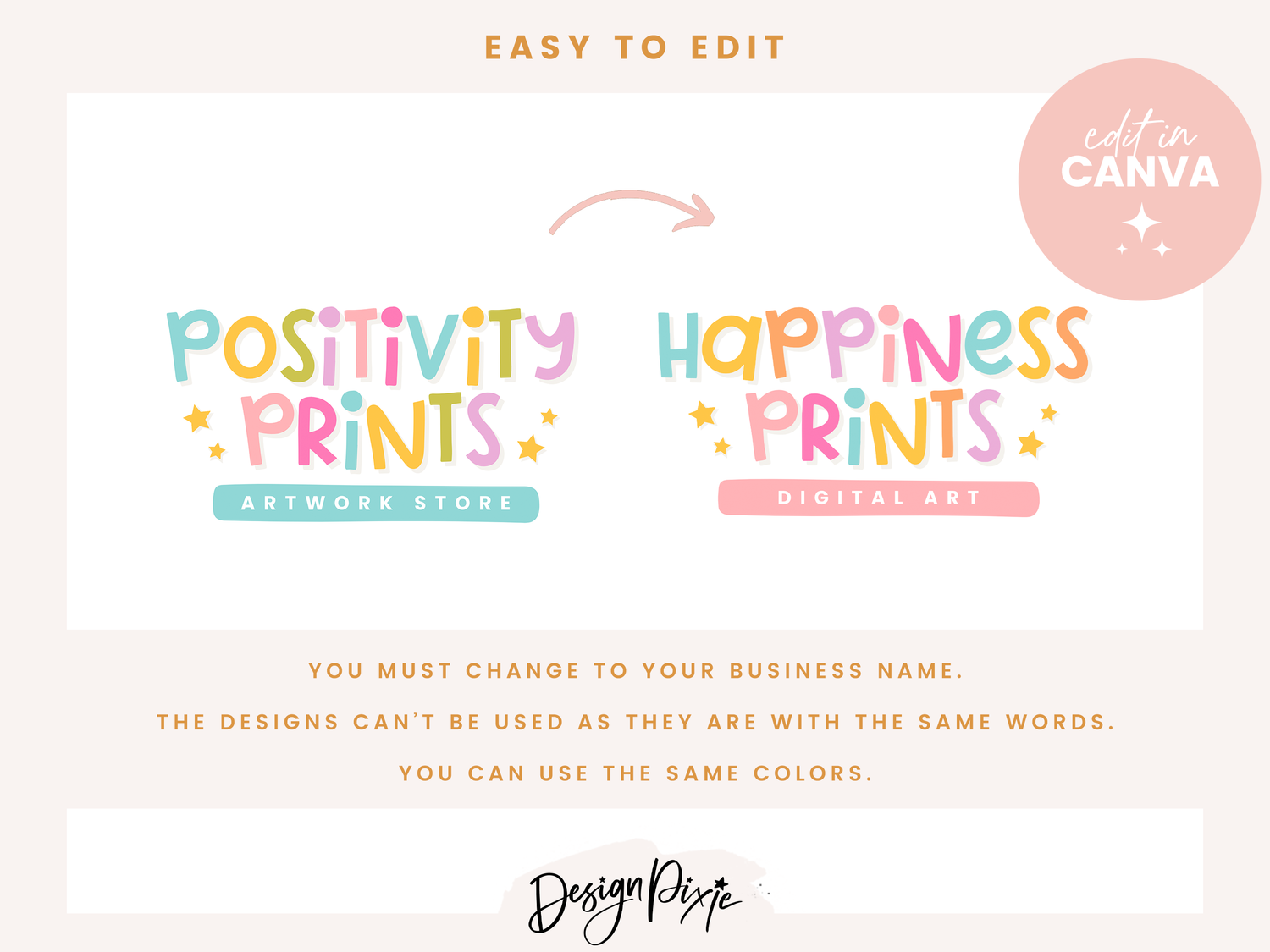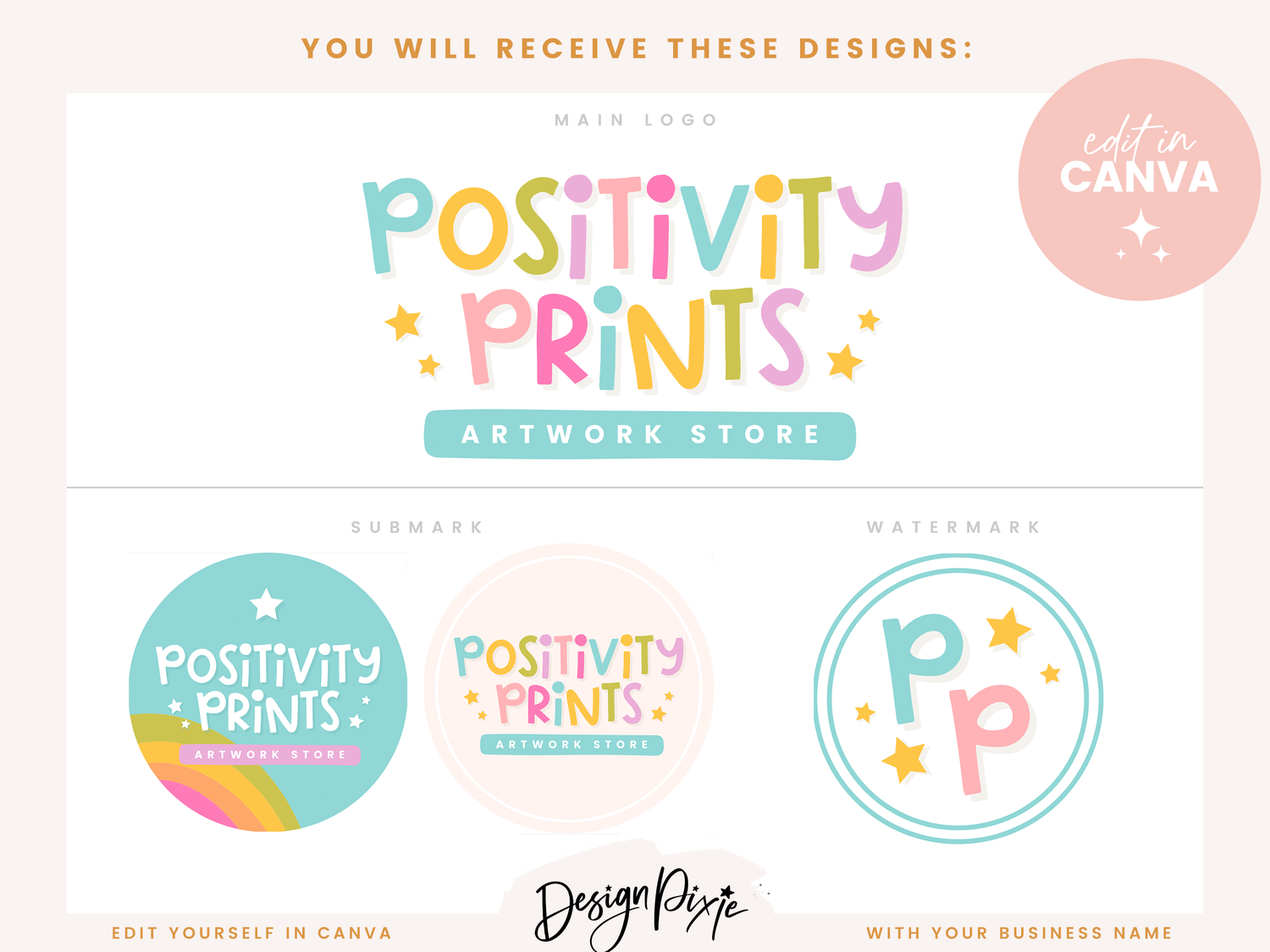 Fun Logo design template to edit yourself in Canva for your small business branding. This DIY rainbow logo design is an editable logo template for Canva. Edit your own custom logo with your own business name using these logo templates by Design Pixie.