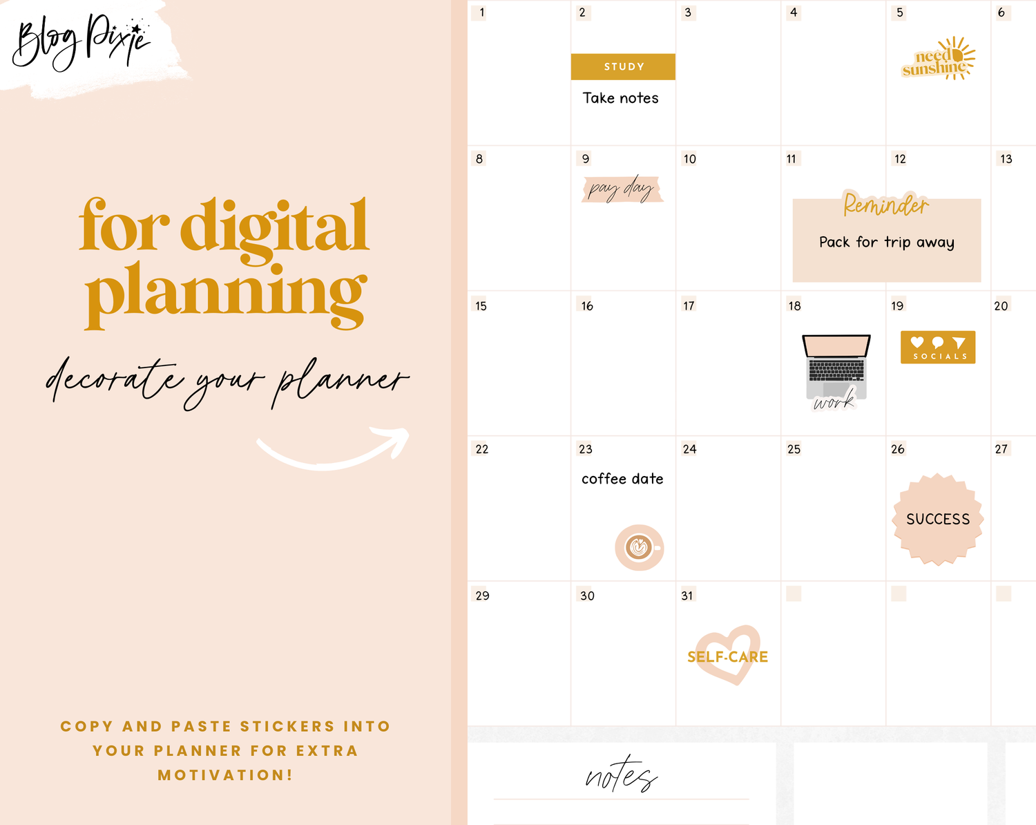 Using digital stickers is an easy and fun way to add color to your digital planner, journal or notebook. These golden yellow and peachy pink sticker sheets by Blog Pixie are pre-cropped and ready to use in a digital planning app.