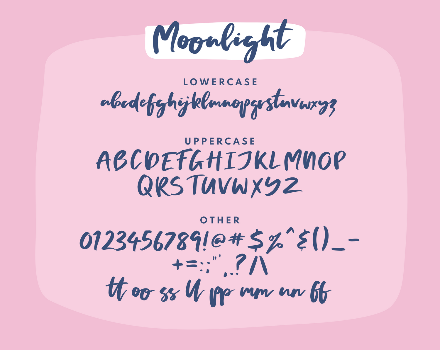 Whether you're crafting cute and bold handwritten text, designing eye-catching logos, or creating striking headings, Moonlight has you covered. Its playful curves and strong presence make it an ideal choice for any project that needs a personal, artistic touch.