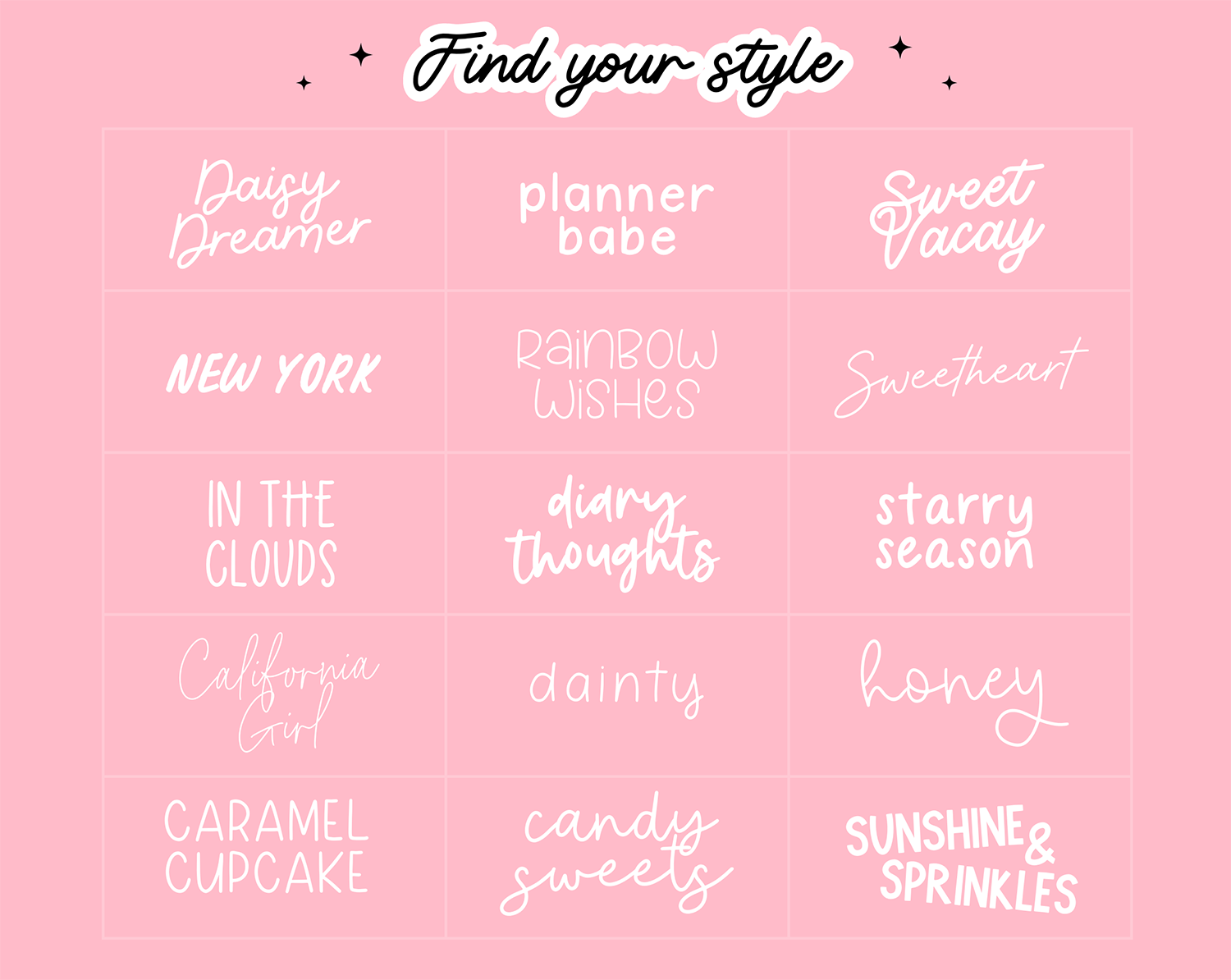 This planner font pack was designed with planning in mind, however can be used for so much more. Instant neat handwriting is yours by using a handwritten font in your planner pages. Take notes in your digital journal and add flair to headings with cursive font styles. There are fonts in all-caps and bouncy script fonts. You can use these fonts for Instagram and to create logos.