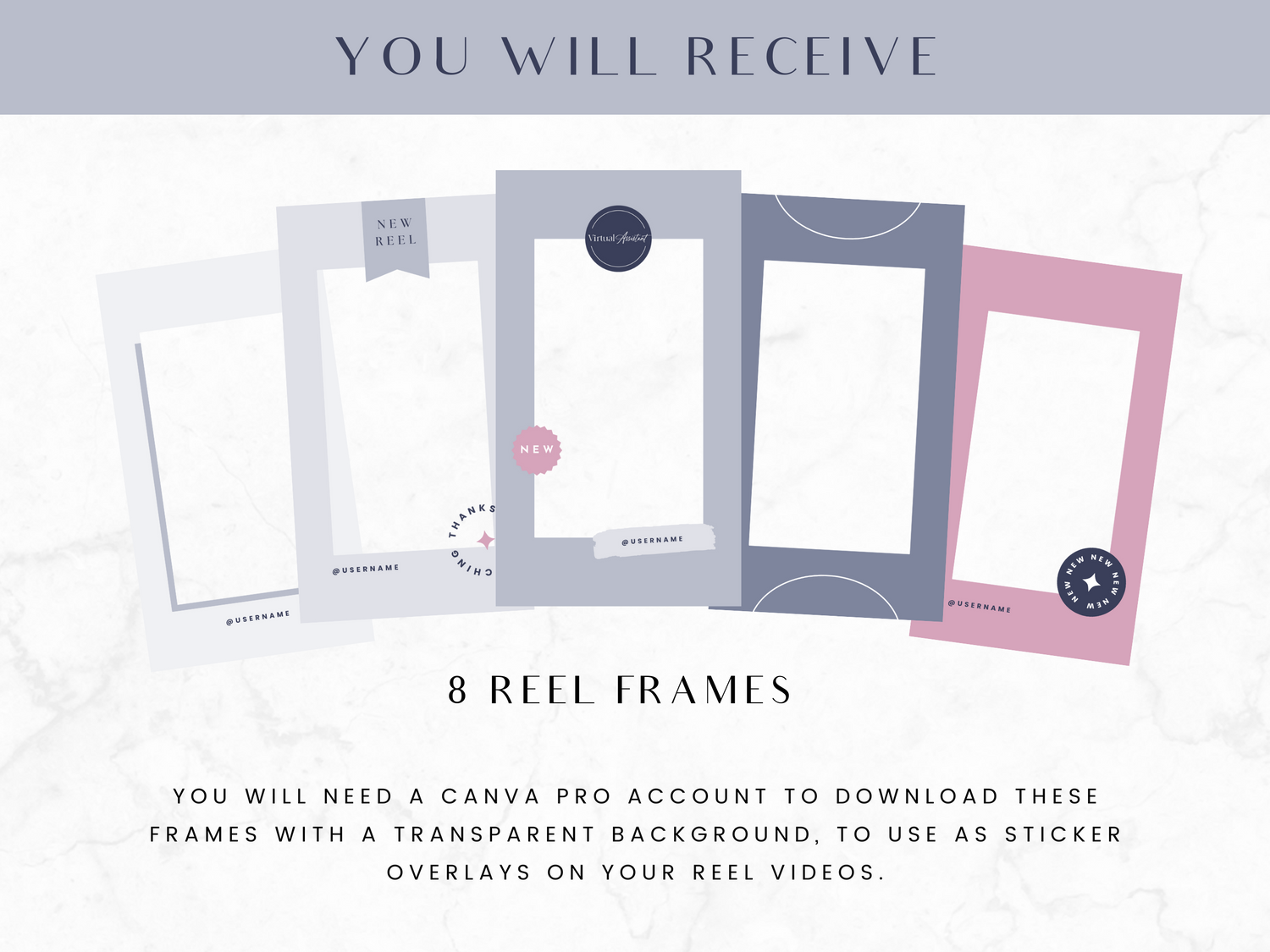 To save the 8 frame templates with a transparent background (to use as Instagram overlay stickers), you will need a Canva Pro account.