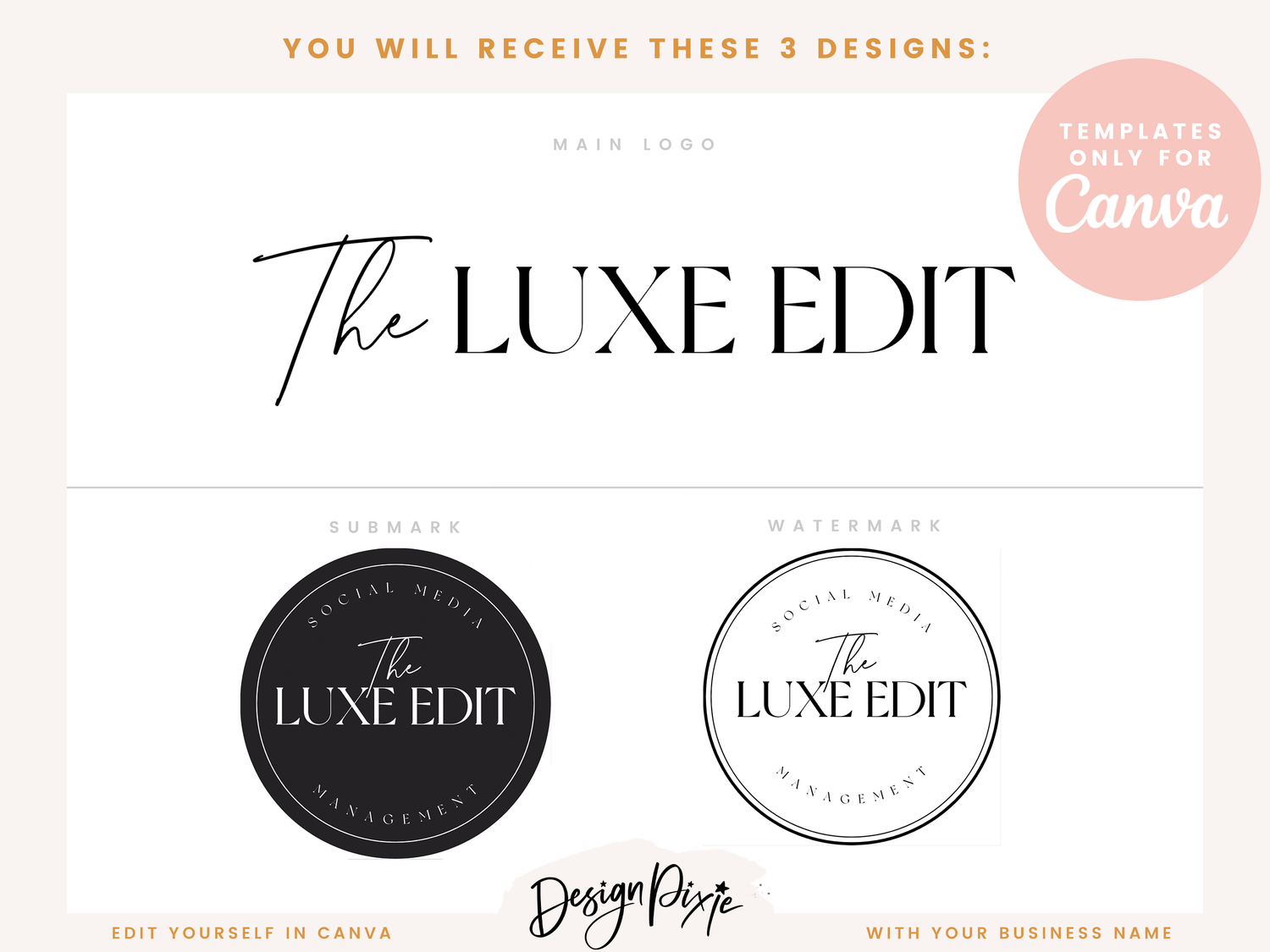 Modern luxe black and white logo design template to edit yourself in Canva. This minimalist black logo is an editable logo design for Canva. Edit your own custom logo with your own business name using these logo templates by Design Pixie.