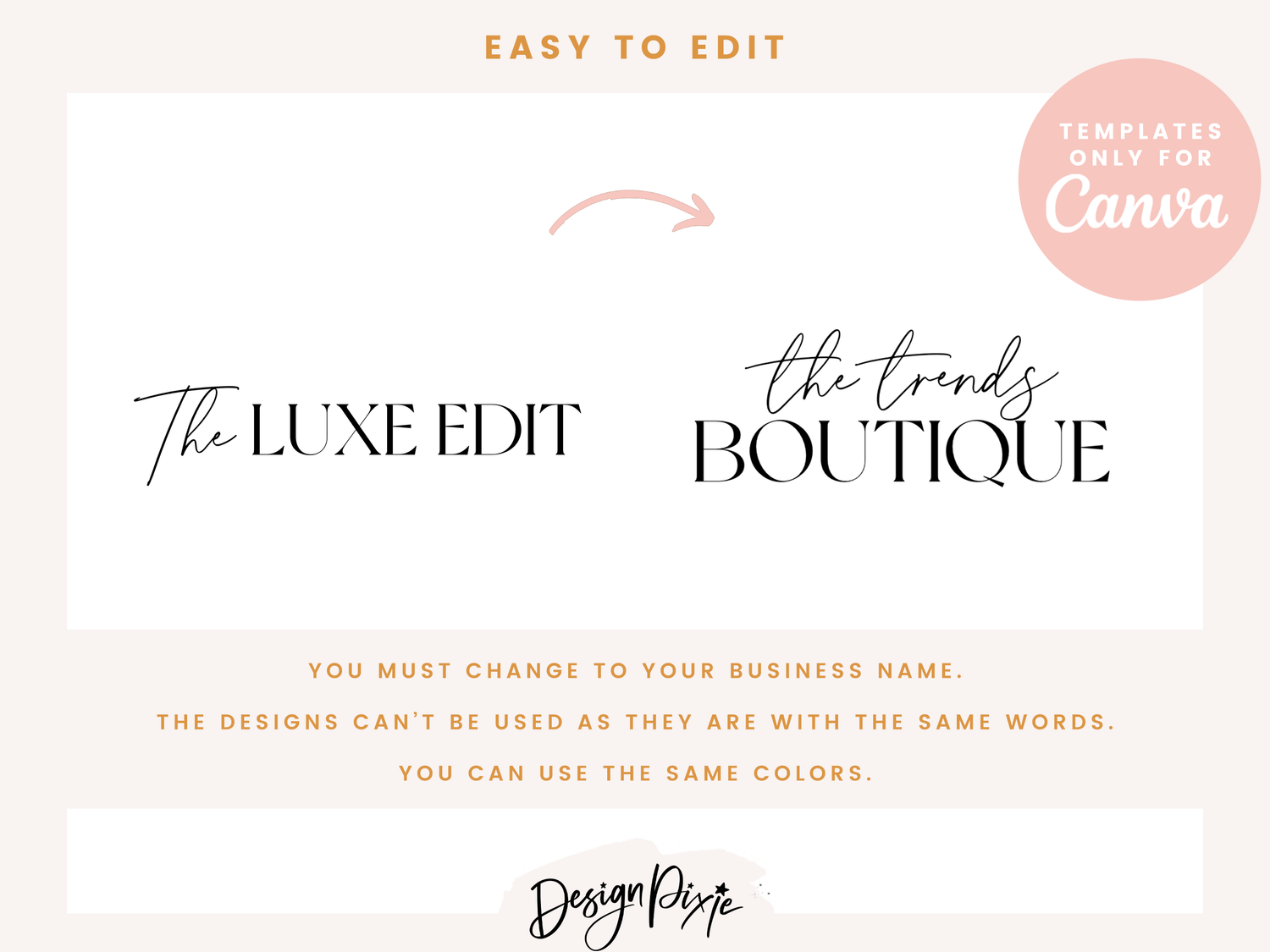 Unfortunately not! You must change the words to your own business name. If your business name is the same as the one shown in the logo, please use a different logo template. The exact logo shown is property of Design Pixie.
