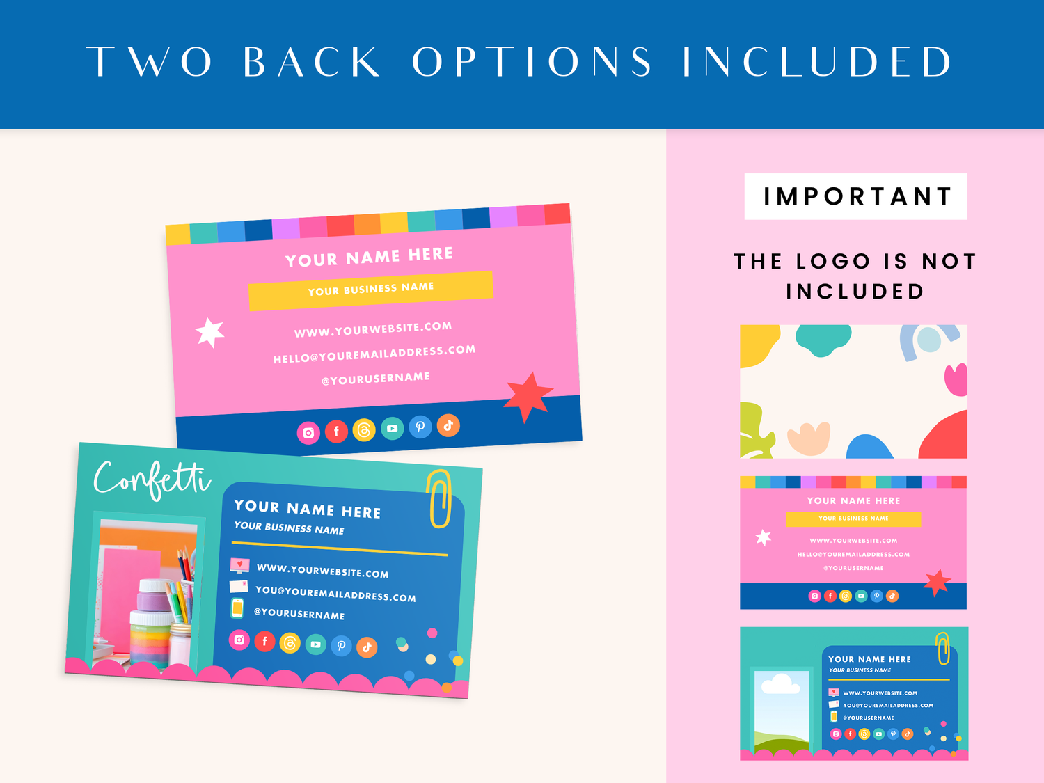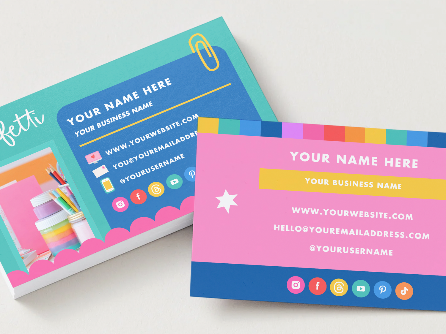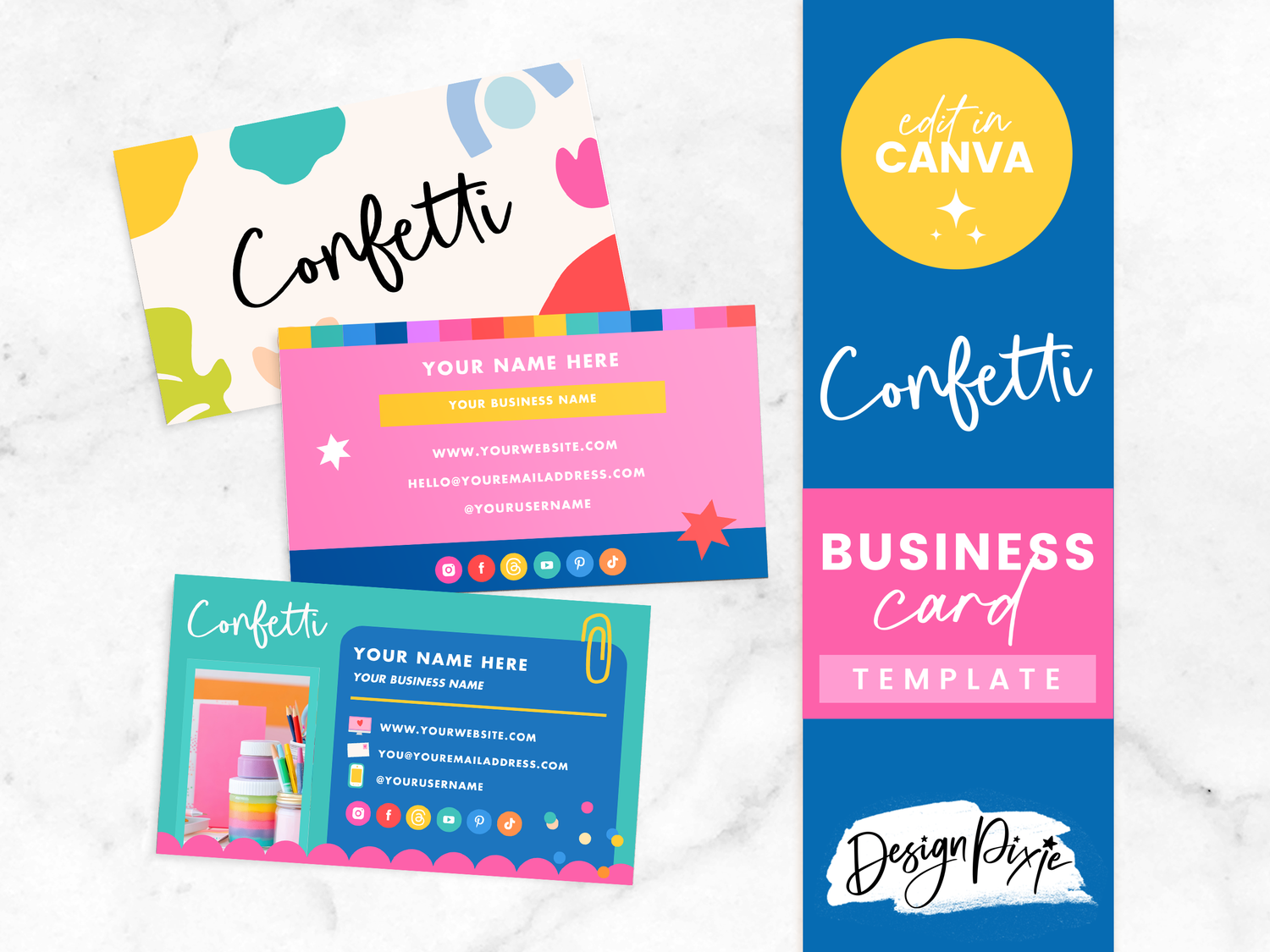 Let your personality shine with this Colorful Canva Business Card Template from the Confetti collection! Designed with bold rainbow colors, playful fonts, and fun confetti details, this template is perfect for creative brands, teachers, crafters, digital product sellers, and small business owners who want to stand out in style.