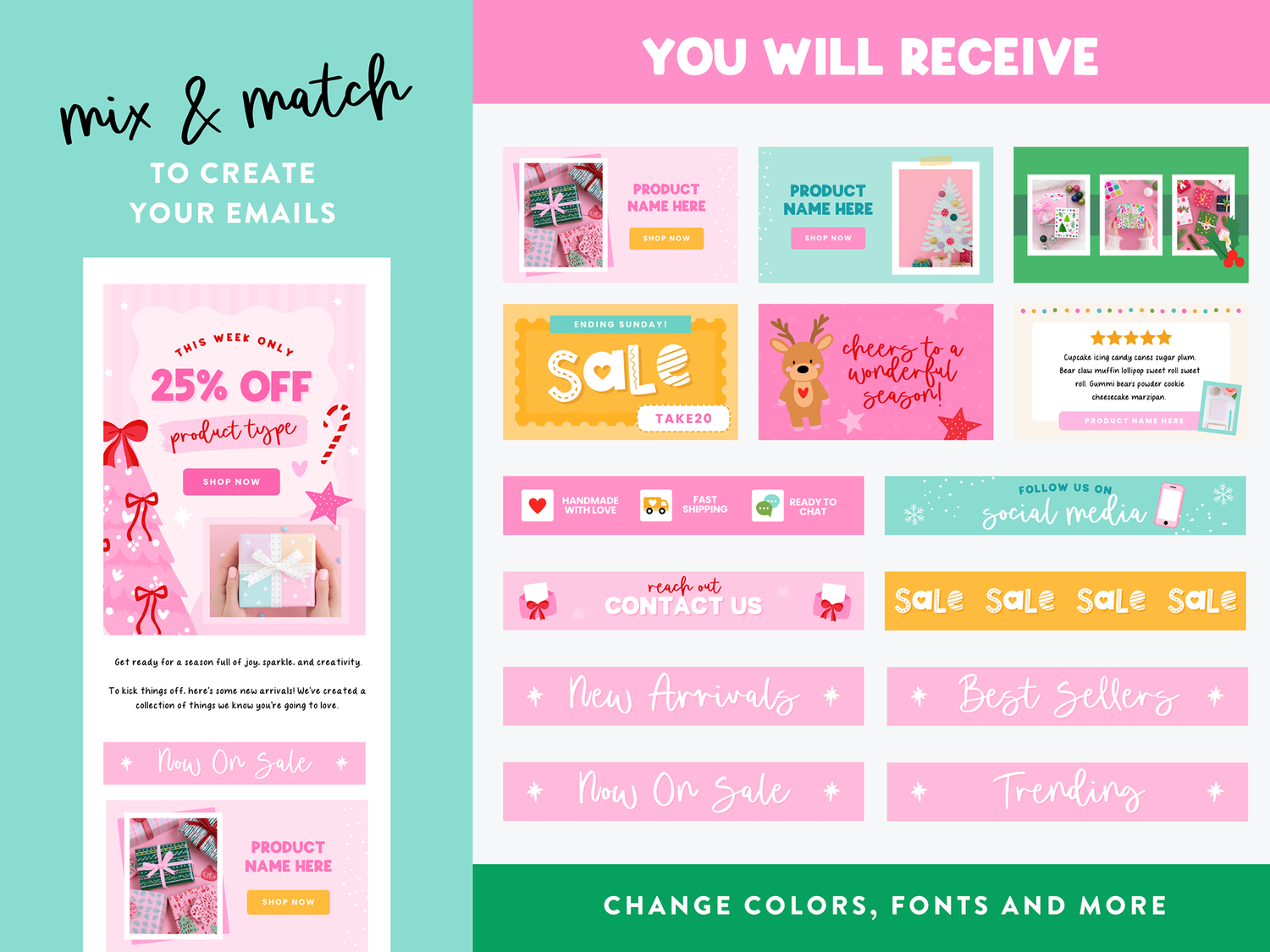 Get your emails holiday-ready with the Colorful Christmas Email Marketing Templates! Bursting with bright rainbow Christmas colors and cute festive graphics, these templates are perfect for sending out cheerful, professional, and on-brand emails this season.