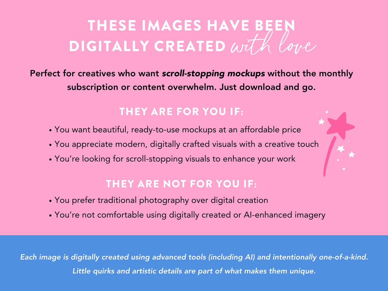 These mockup images were digitally created using advanced tools including AI - think a sprinkle of tech mixed with a lot of creativity! They are one-of-a-kind, and any little quirks and artistic details are part of what makes them unique. I believe in using digital tools to help you create a beautiful brand and stylish business.