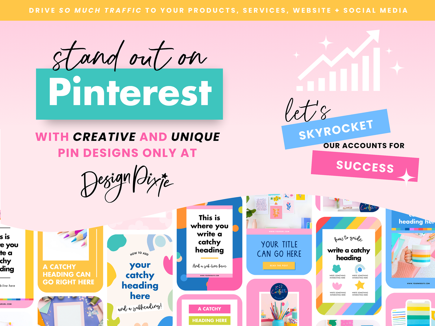 Use the templates as they are or change up the colors, fonts and graphics. Use the placeholder text to write your own catchy headings relevant to your products, blog posts or services. Download as JPG or PNG images to have content ready to post to your Pinterest account.