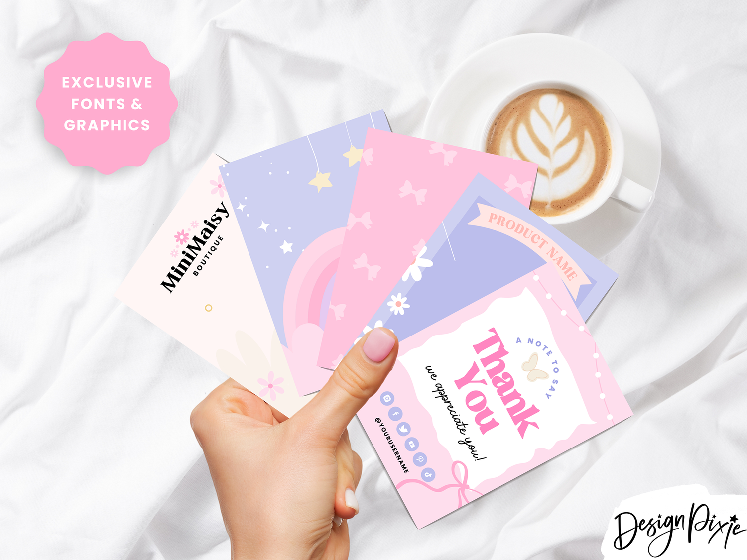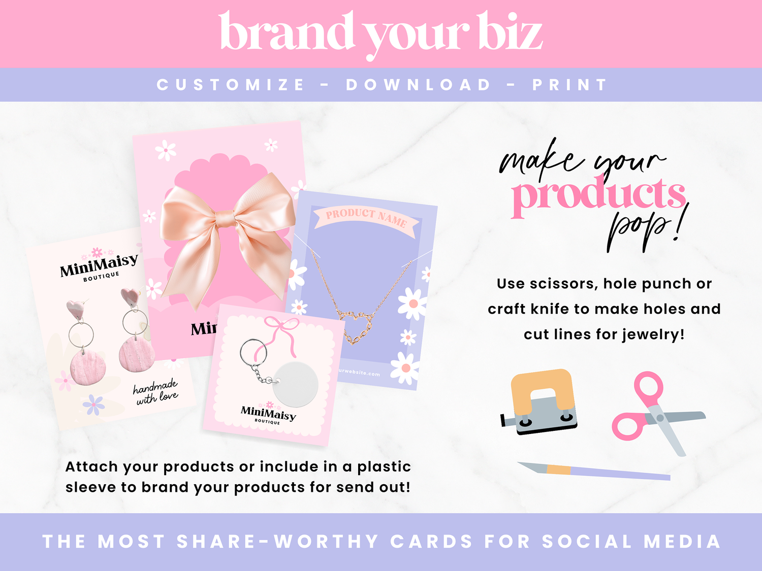 Add a touch of girly charm to your product packaging with these Girly Pink Display Card Templates! Perfect for small businesses selling jewelry, hair bows, and accessories, these Canva-editable templates feature a dreamy mix of pinks, purples, bows, butterflies, flowers, and polka dots to make your products pop.