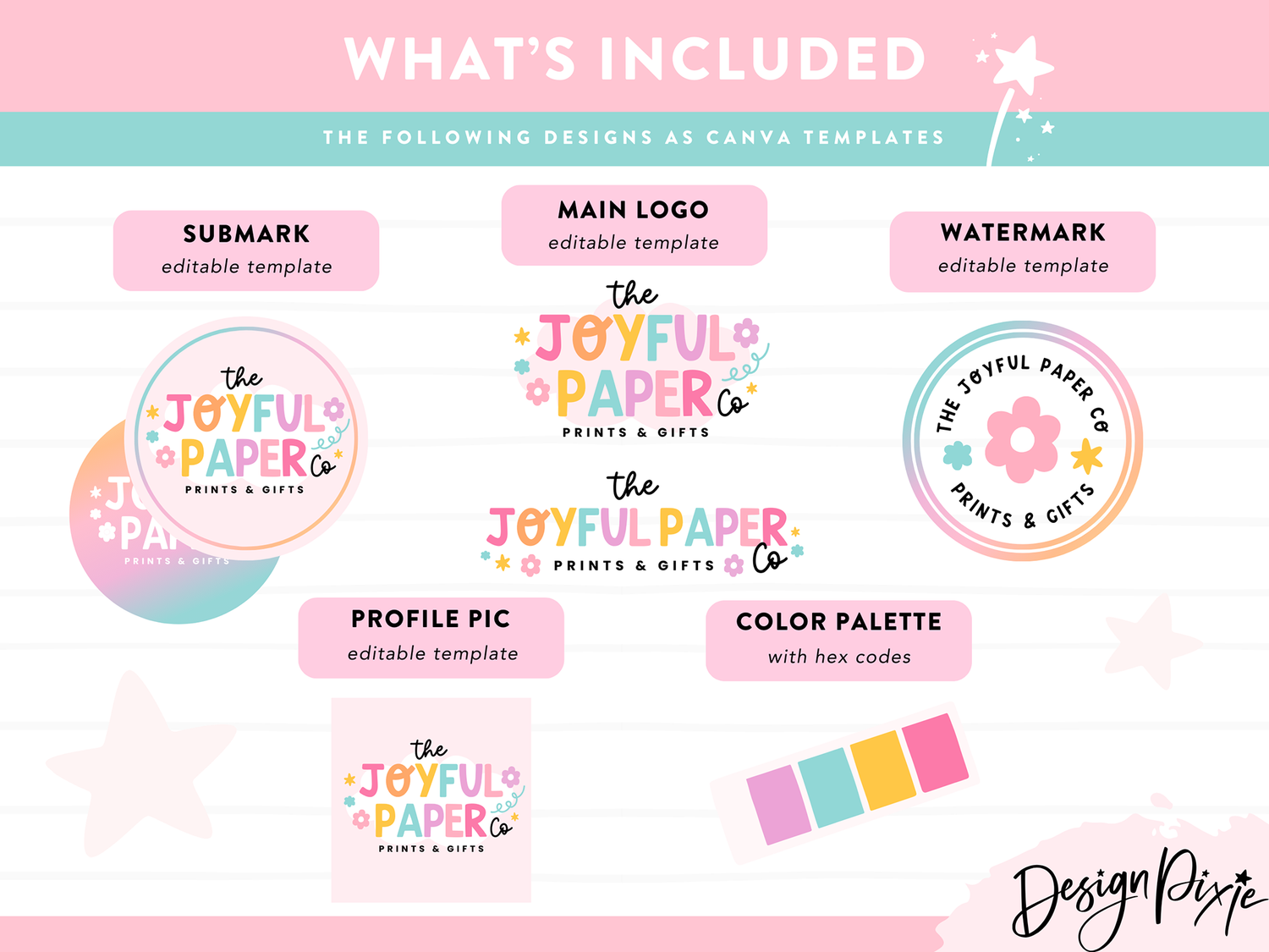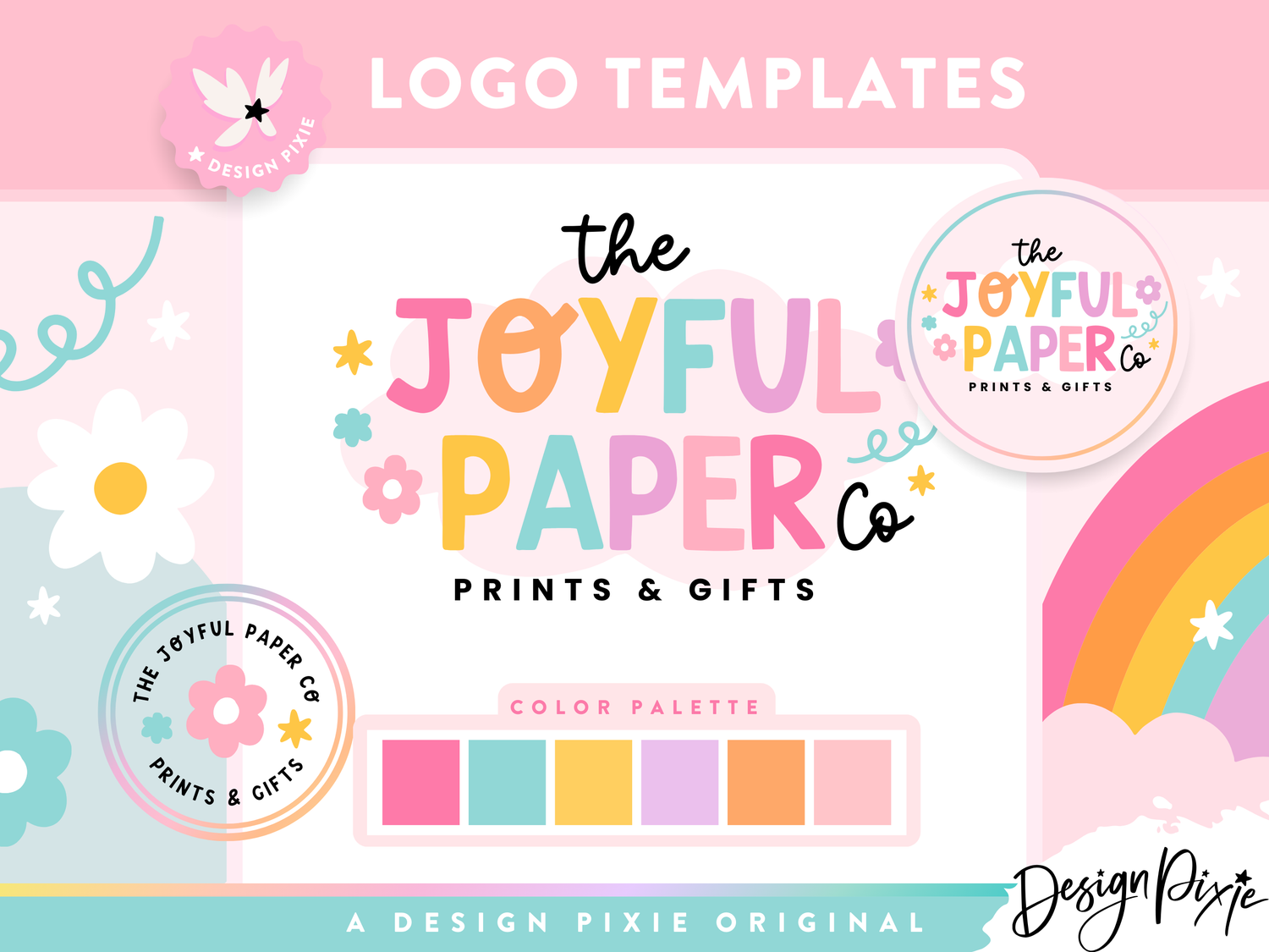 Rainbow Logo design template to edit yourself in Canva for your small business branding. This DIY logo design is an editable logo template for Canva. Edit your own custom logo with your own business name using these logo templates by Design Pixie.