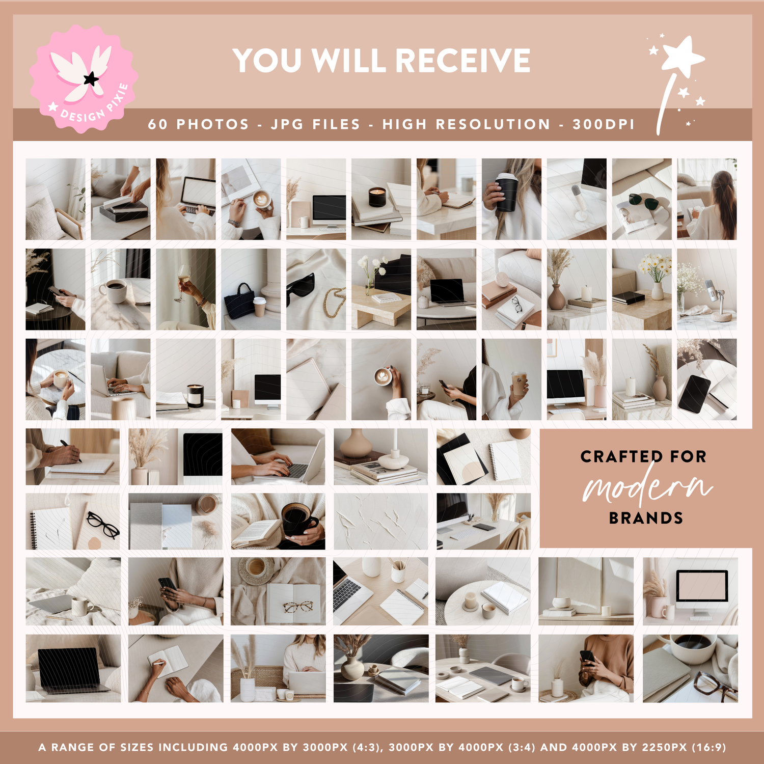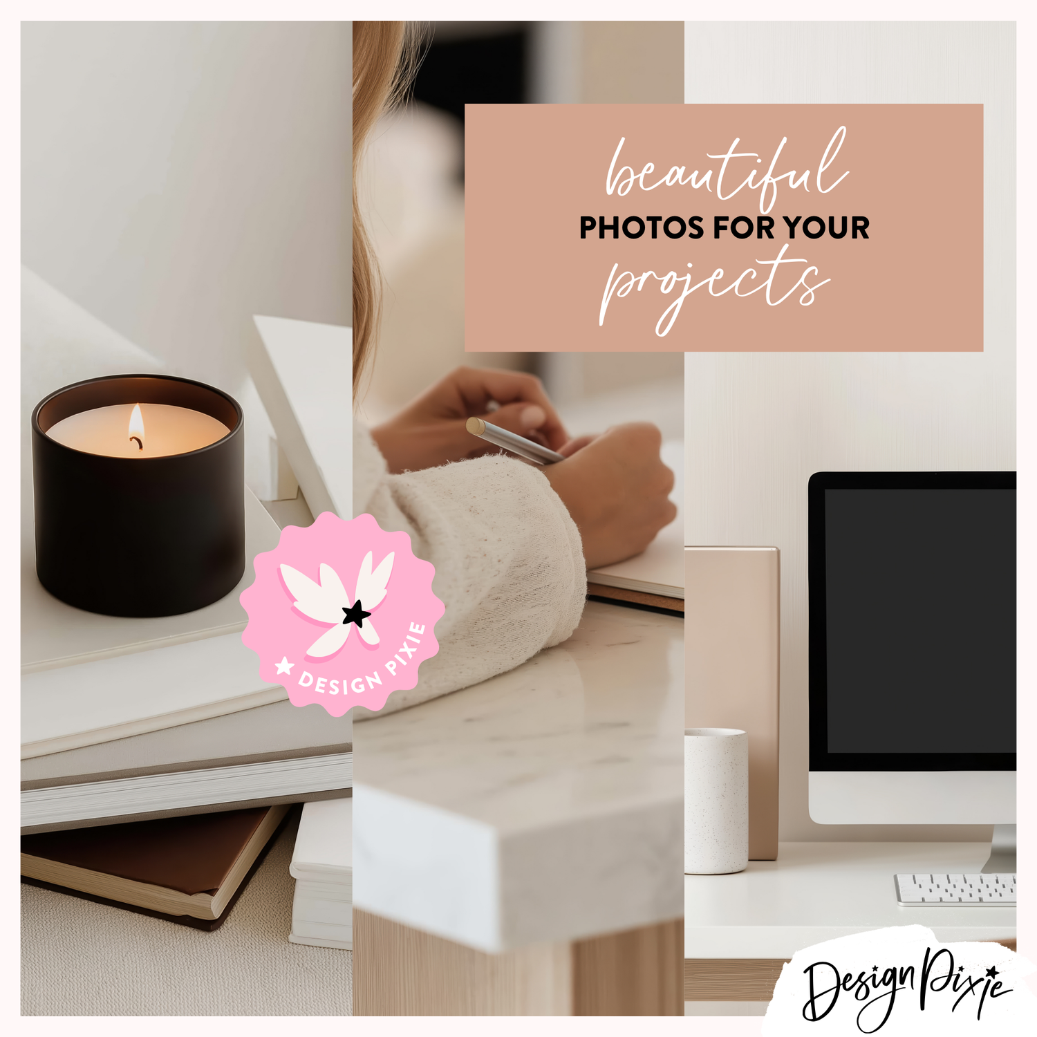 With a clean, minimal look and a slightly moody edge, this collection features beautifully styled neutral-toned flatlays and lifestyle scenes. Think beige, taupe, greys, and soft shadows - paired with tech mockups, desk setups, coffee tables, candles, notebooks, and work-from-home or office vibes.