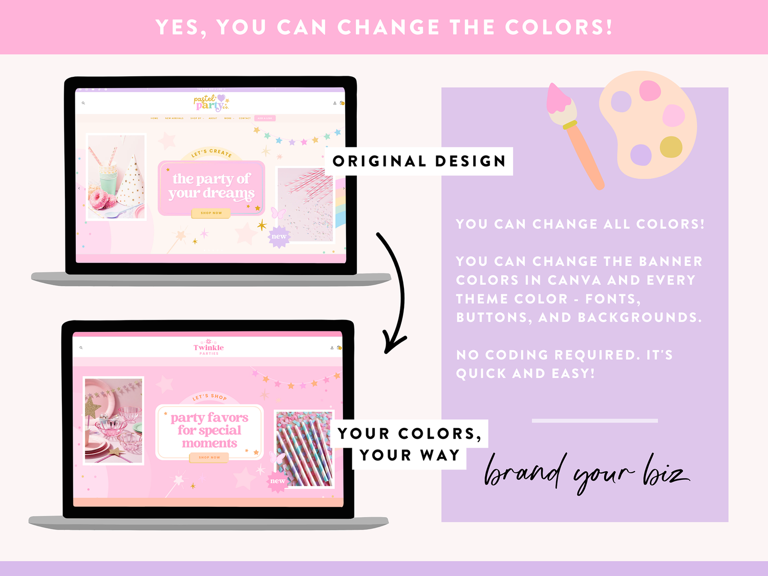 - Your own logo image to add in where the Pastel Party example logo is shown in the live demo