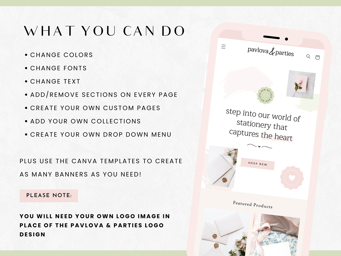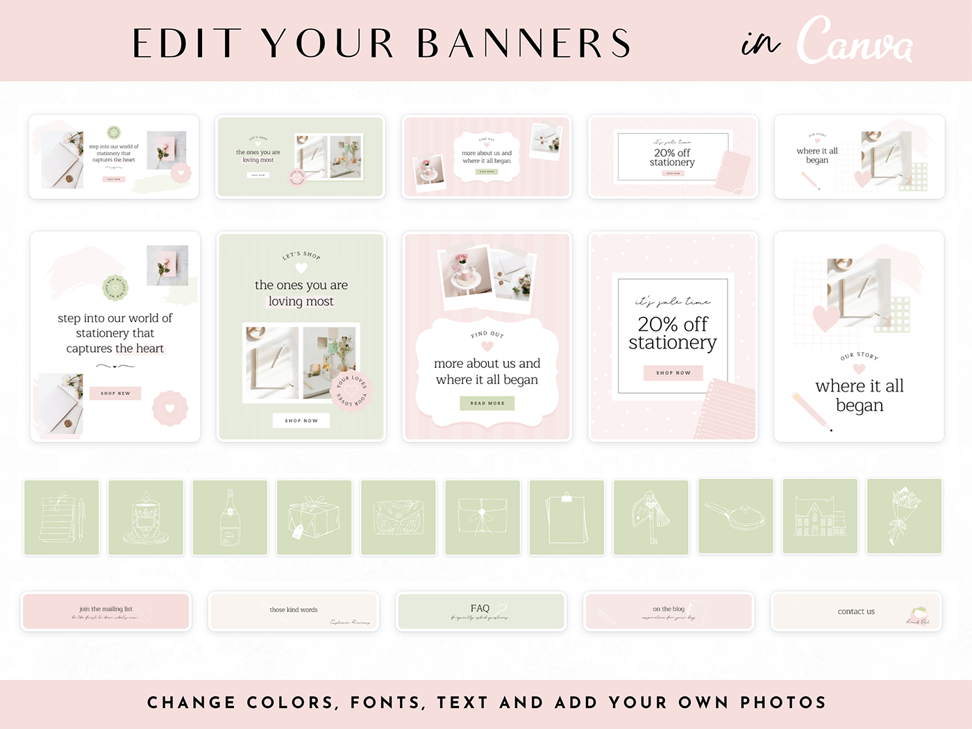 Shopify Theme Template in a pretty, feminine pink and sage green design for your online boutique. The perfect Shopify theme for digital products, stationery, printables, invitations, clothing, art, jewelry and more. Give your online store a makeover with stylish ecommerce banners to edit in Canva and a new Shopify website design.