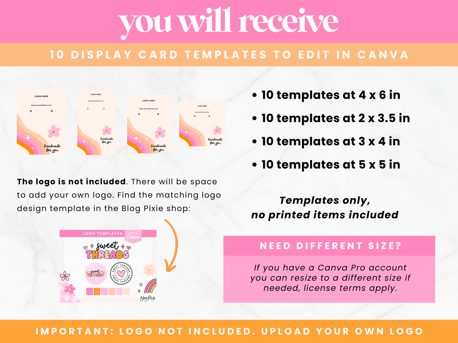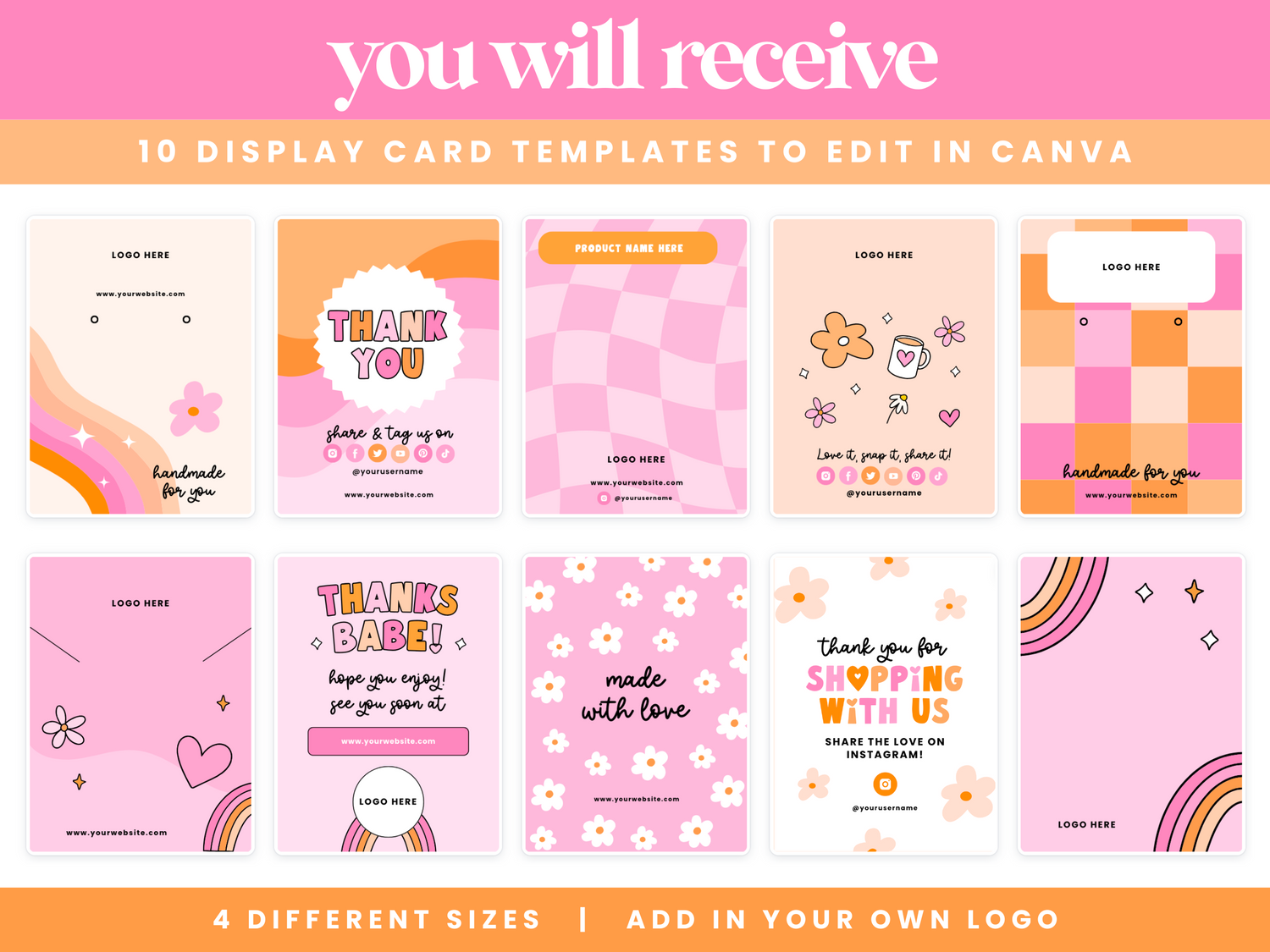 Pink Retro Display Card templates to edit in Canva. Brand your small business with pink product display cards that you can print and send with customer orders.