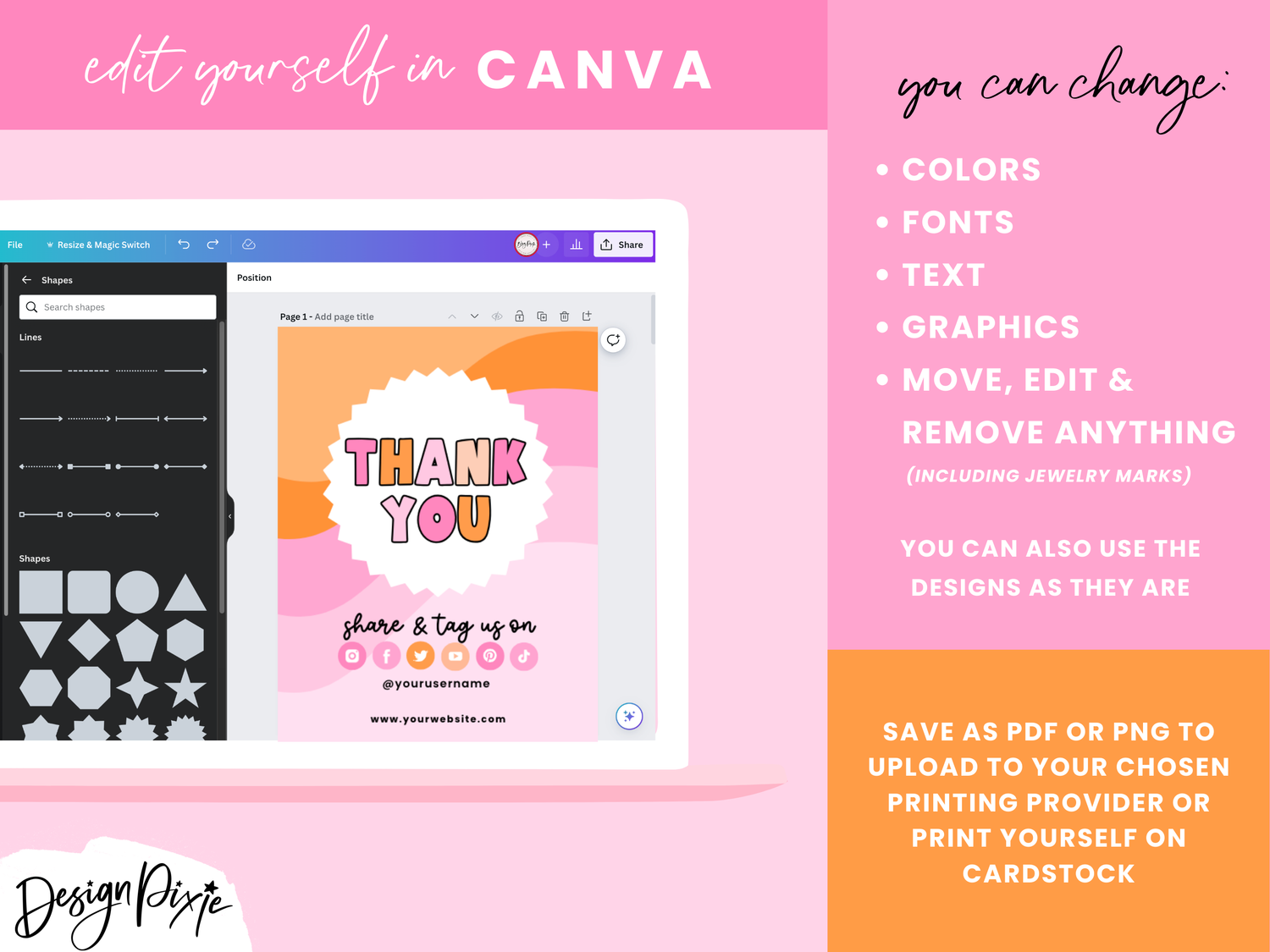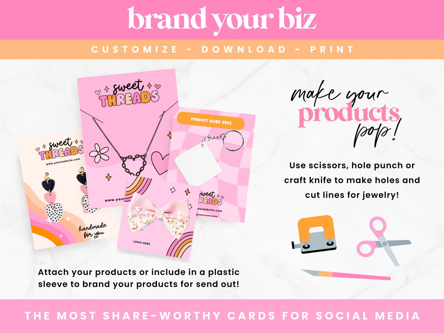 These display card templates can be used in many different ways for your small business. You can use them as jewelry display cards and attach earrings, necklaces and bracelets. They can be used as backing cards for hair bows, hair clips, keychains, buttons and more. You can also pop them into parcels for extra branding to create a memorable experience for your customers.