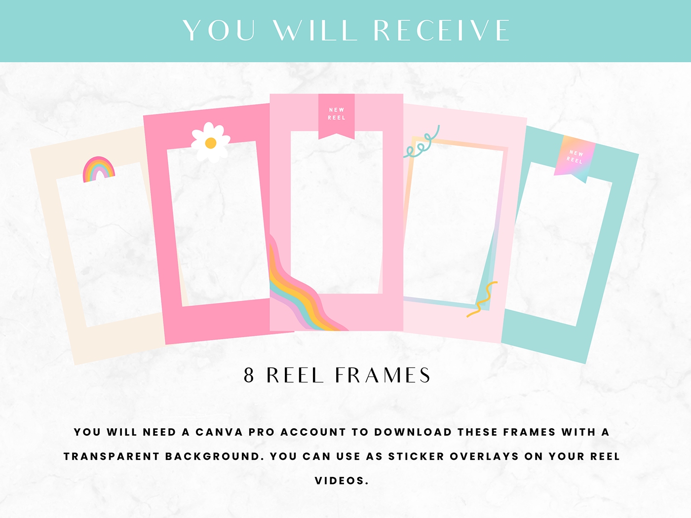 To save the 8 frames with a transparent background (to use as Instagram overlay stickers), you will need a Canva Pro account.