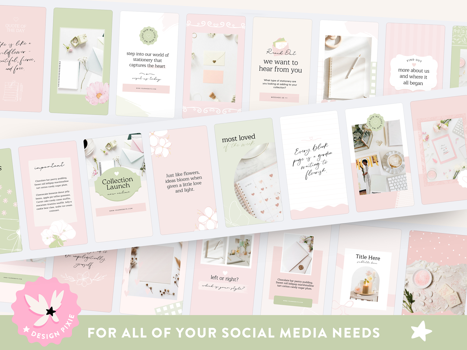 Featuring delicate patterns, ornate decorative borders, watercolor flowers, and elegant line art, these templates bring a soft, romantic touch to your social media. The soft pastel palette of blush pink, sage green, and neutrals adds a timeless, elegant feel, while the hand-drawn line art and floral details create a look that’s effortlessly chic.
