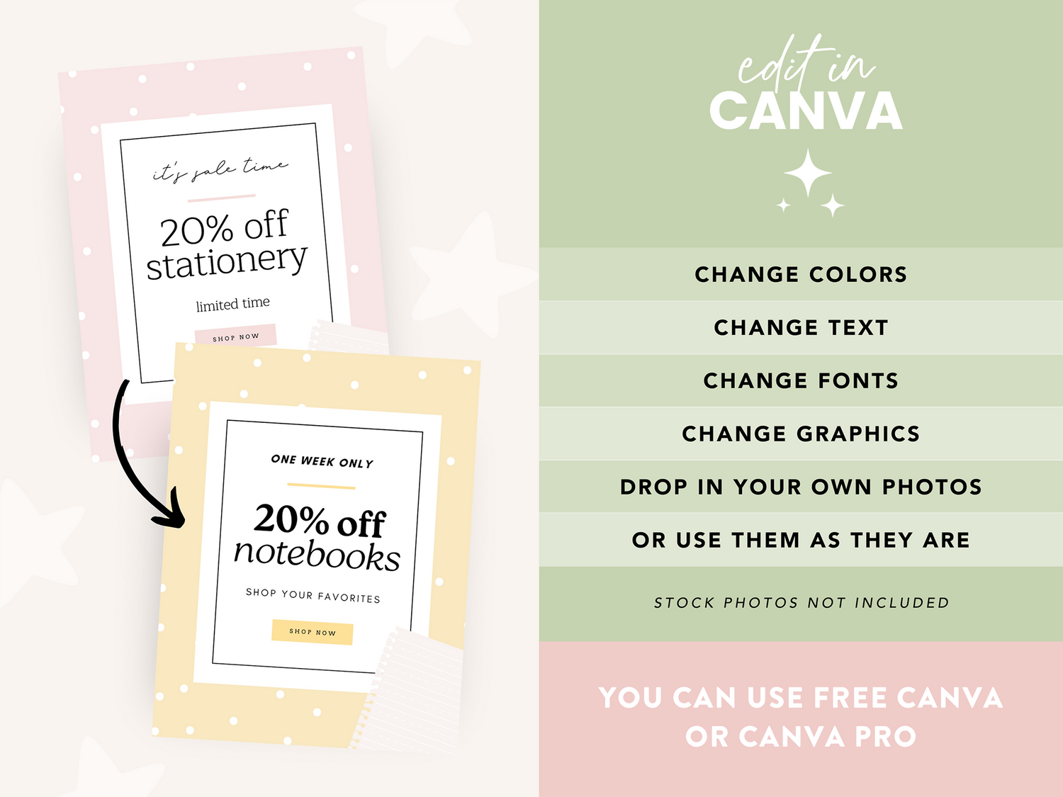 Please Note: Stock photos not included. There will be image placeholders to drop your own photos in, or search the Elements tab in Canva for photos to use.