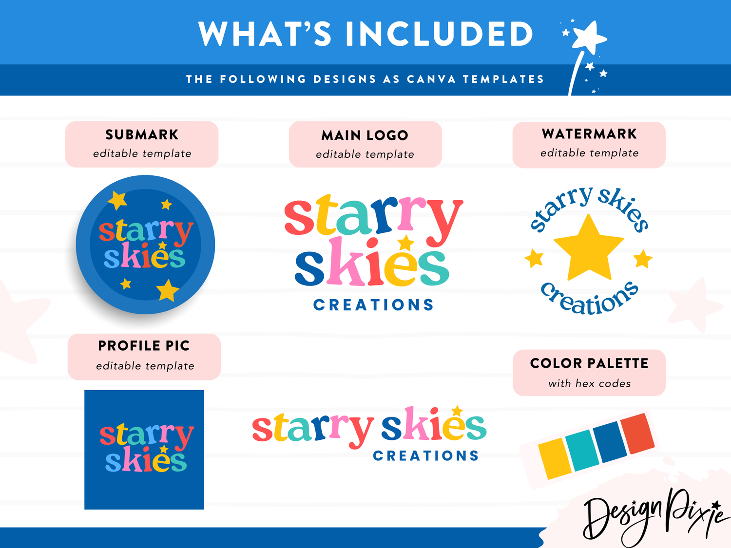 Give your brand a bold, playful, and eye-catching look with the Starry Skies logo template! Designed with bright primary colors, serif typography and star graphics, this logo is perfect for kids brands, educational businesses, daycares, creative studios, and beyond. Whether you’re launching a new business or refreshing your brand, this easy-to-edit Canva template makes customization a breeze!
