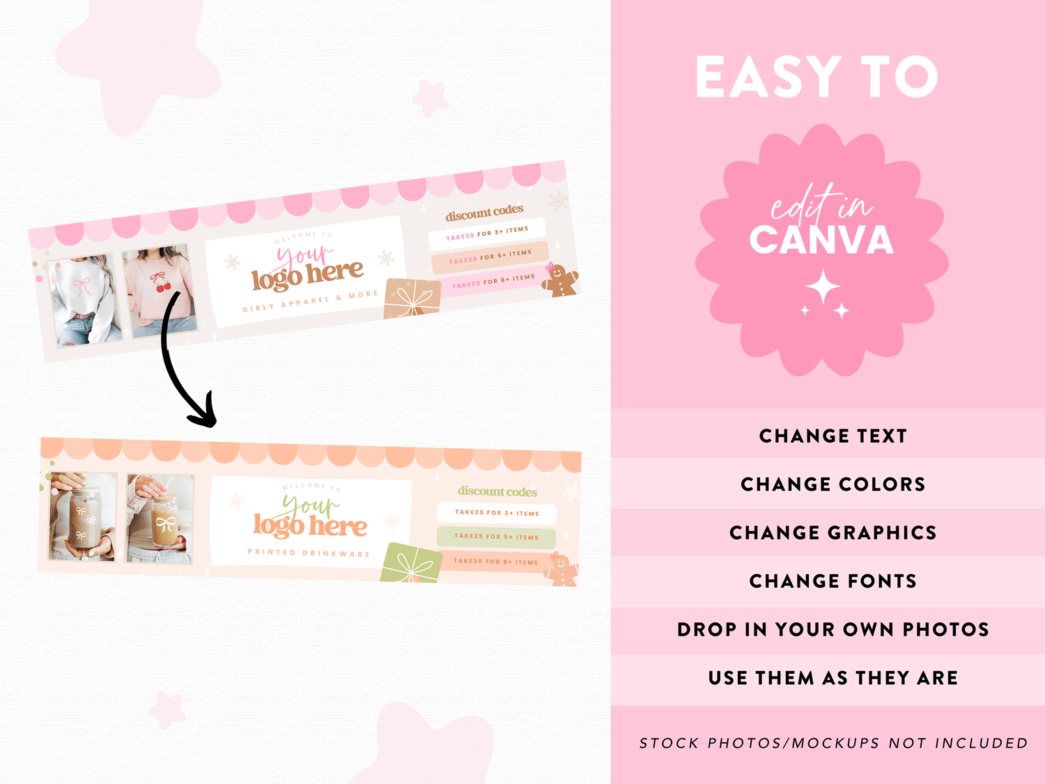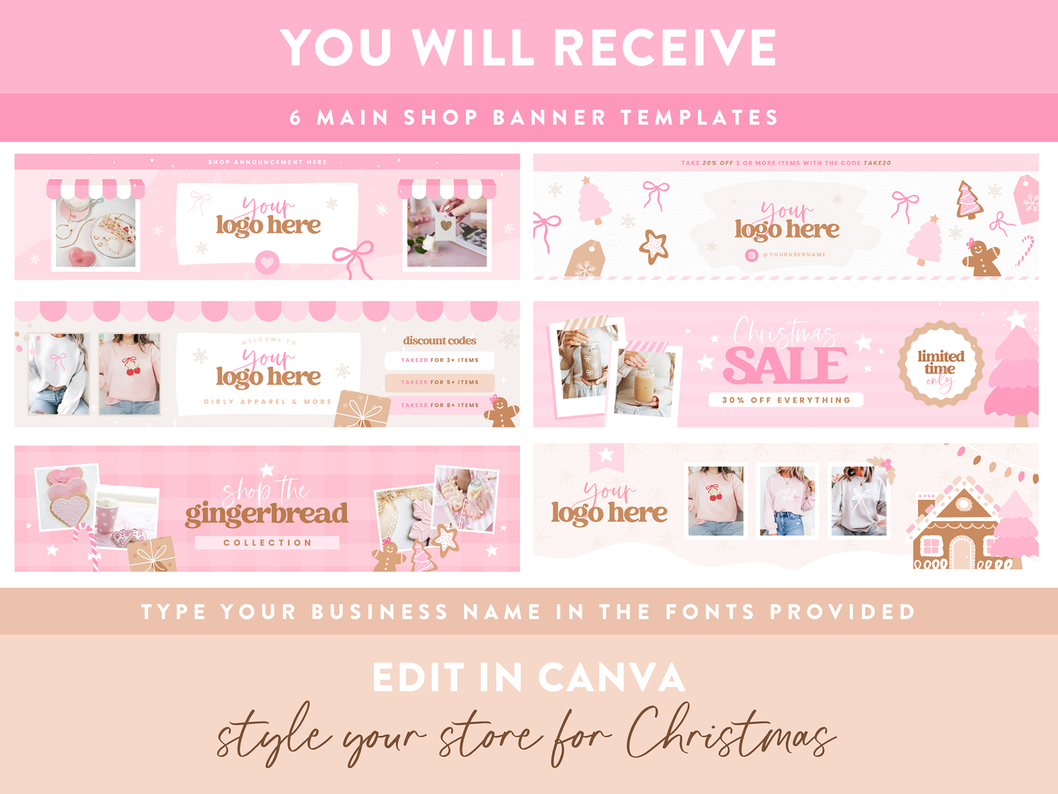 Turn your Etsy store into a pink winter wonderland with our Pink Christmas Etsy Shop Banner Templates! This bundle includes 6 beautifully designed shop banners featuring soft pinks, girly bows, gingerbread cookies, candy canes, and all the pretty holiday vibes. Each template is fully editable in Canva, allowing you to customize colors, text and graphics to fit your unique brand aesthetic with ease.