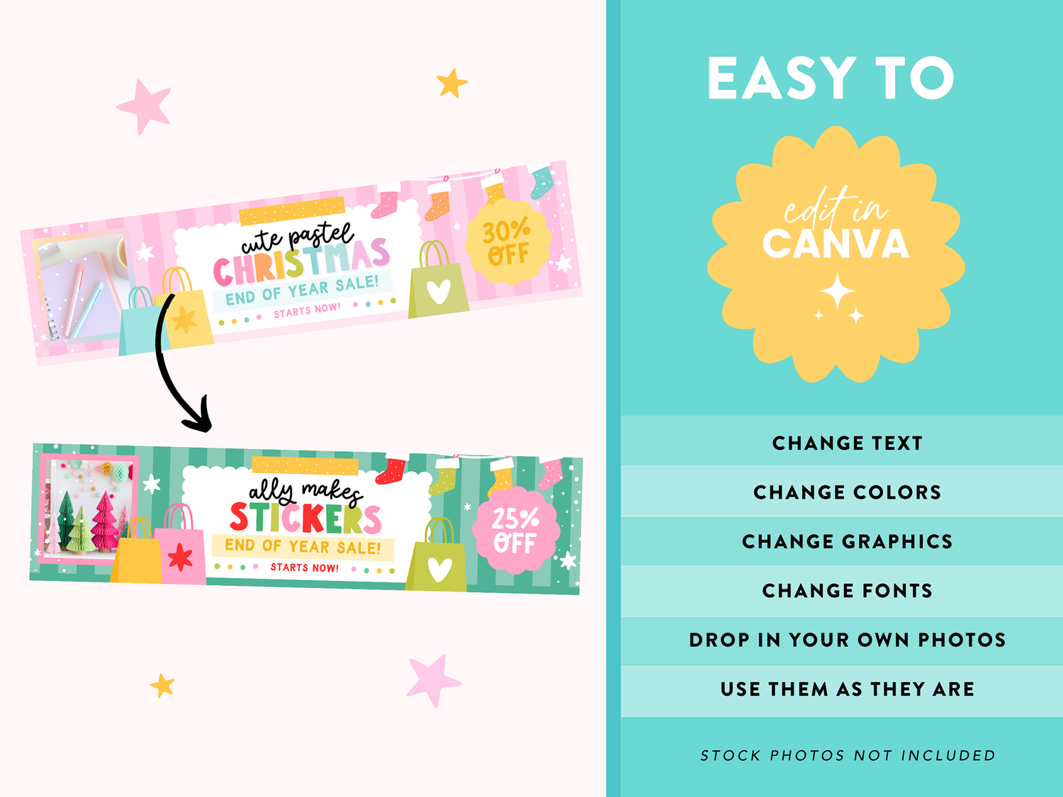Bring a little pastel magic to your Etsy shop this Christmas! The Pastel Christmas Etsy Shop Kit is part of the Playful Collection and features adorable pastel rainbow graphics, dreamy stars, candy canes, and festive charm - all designed to make your shop stand out this holiday season.