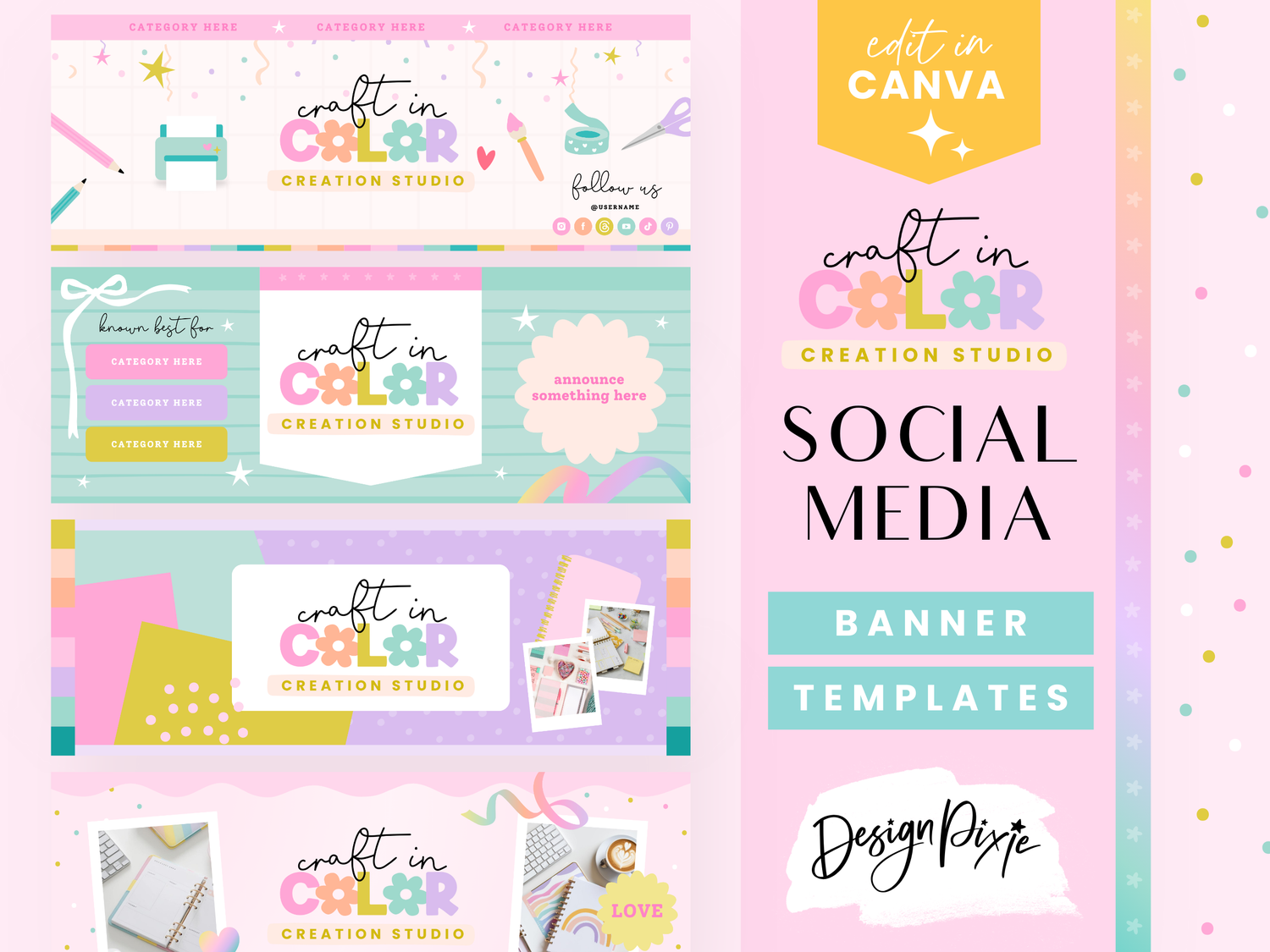 These editable social banner templates are sized for your social media. There's Facebook banner templates, Youtube covers, Pinterest cover images and Twitter/X covers. They are full of rainbow colors and fun graphics.