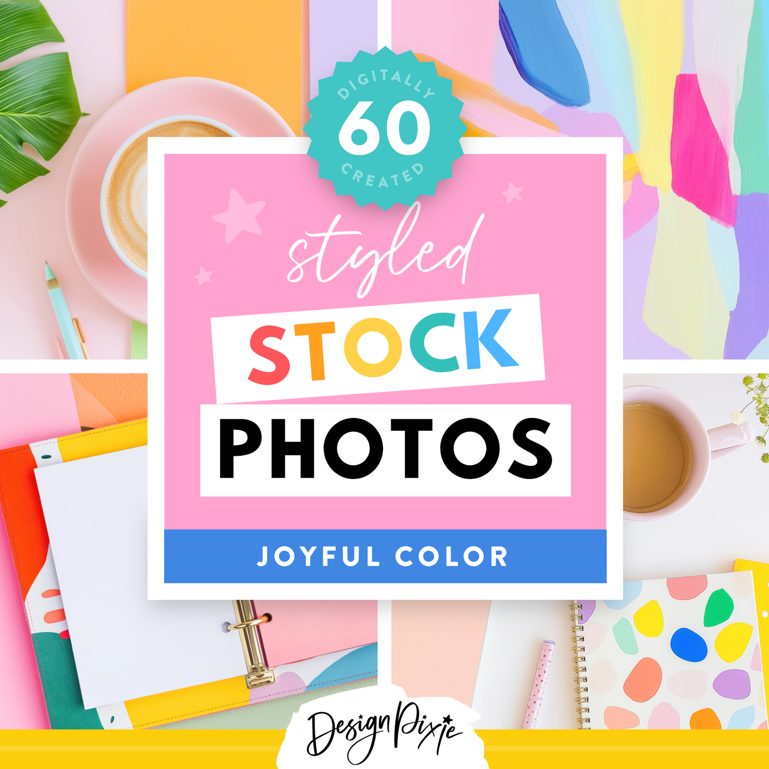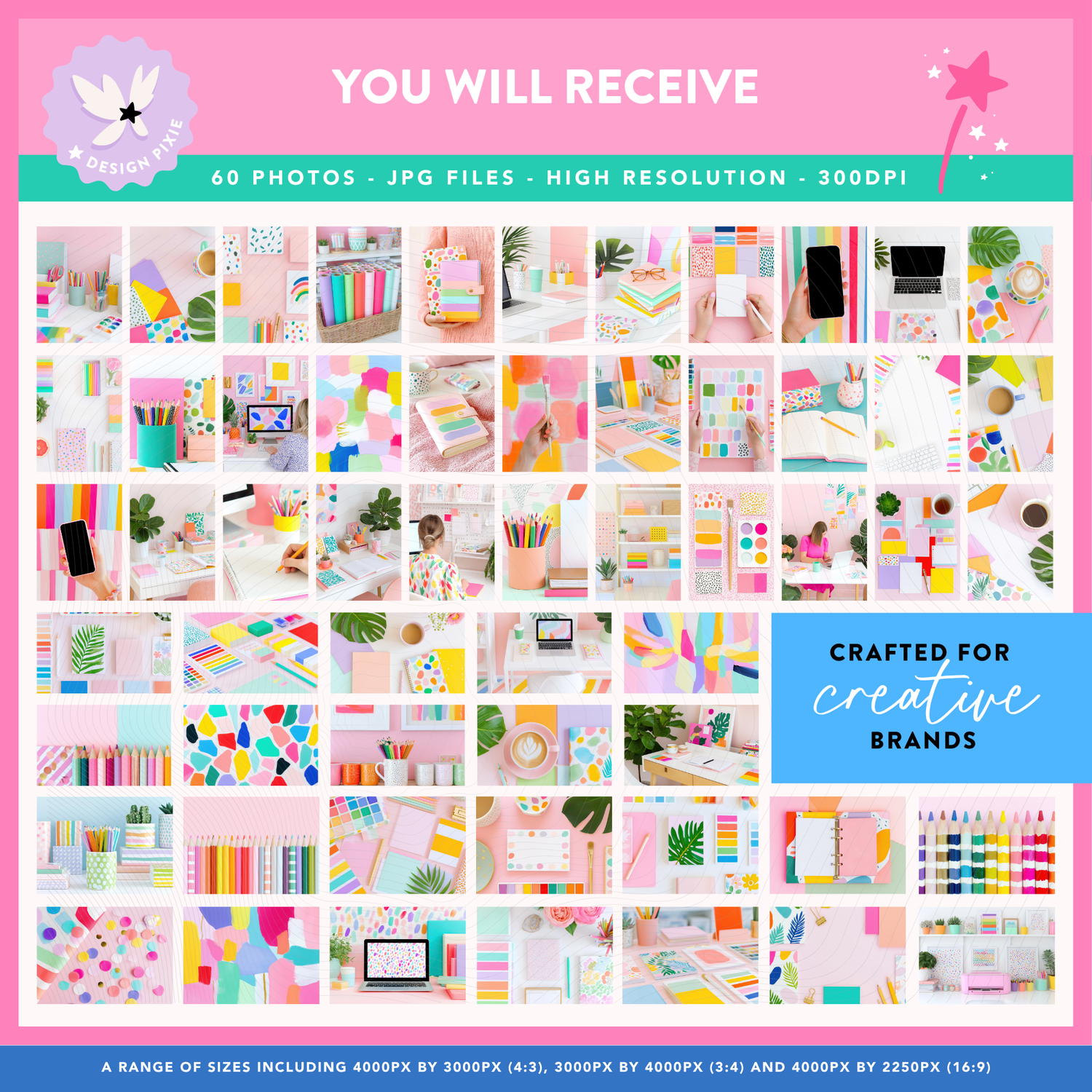 This vibrant bundle includes 60 bright and colorful styled stock photos featuring cheerful flatlays with colored pencils, paint splashes, planners, stationery, and eye-catching desk scenes. Every image is bursting with creativity and designed to make your content pop.