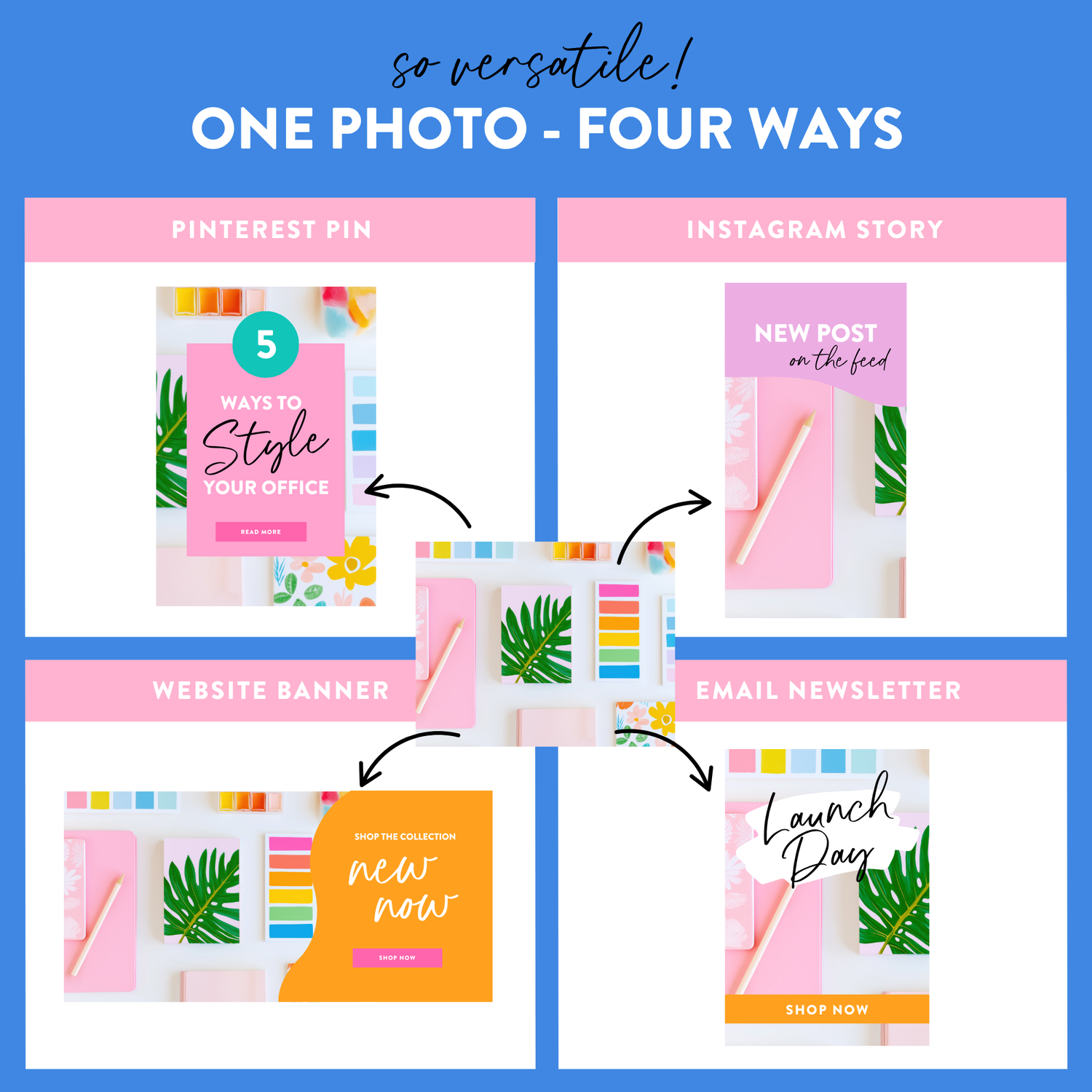 Perfect for websites, Instagram, blog posts, email marketing and more. Use each photo in multiple ways to keep your brand fresh and cohesive.