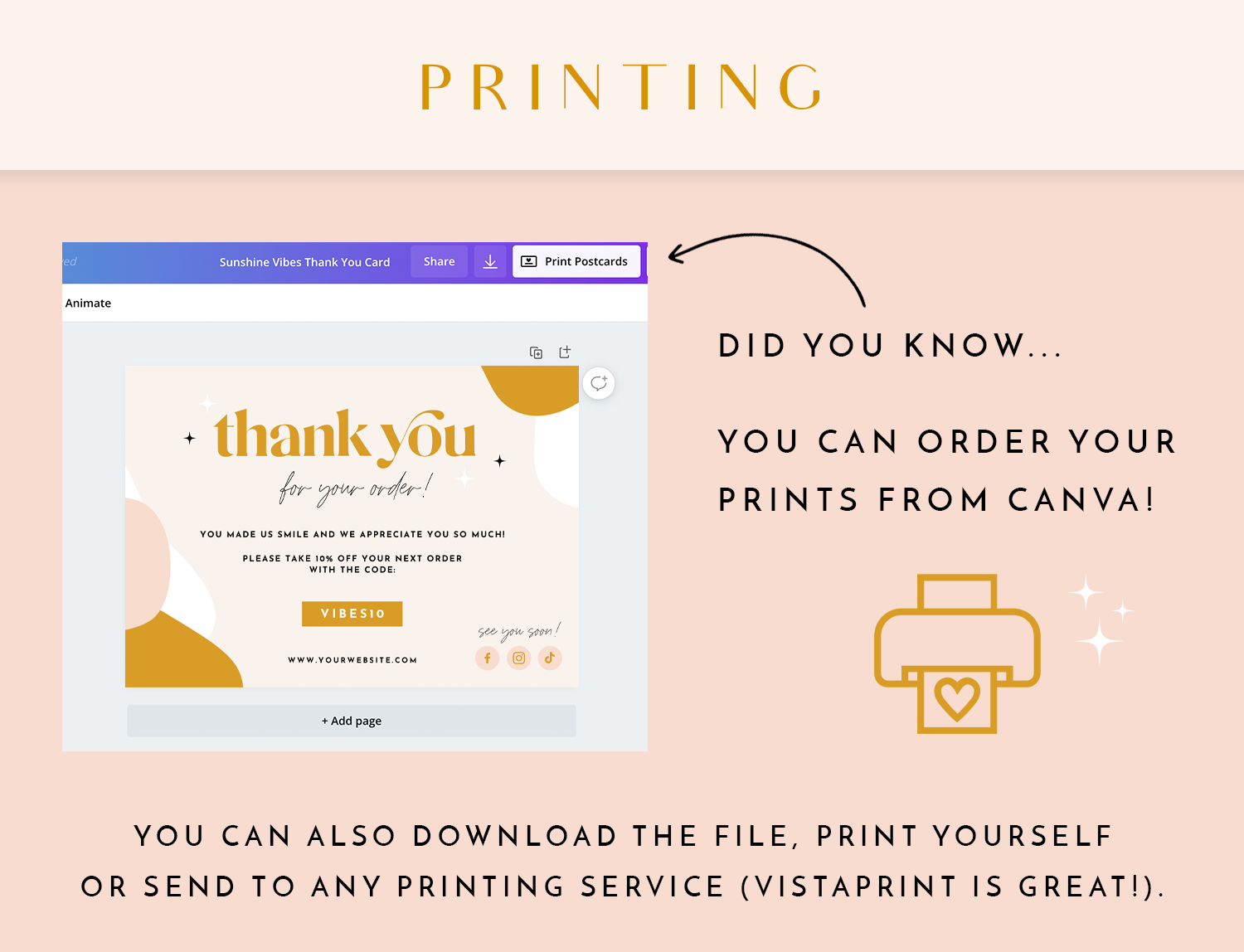 Boho thank You Card template to edit in Canva in the Sunshine Vibes design! Brand your small business with cute, boho Thank You cards that you can print and send out with orders.