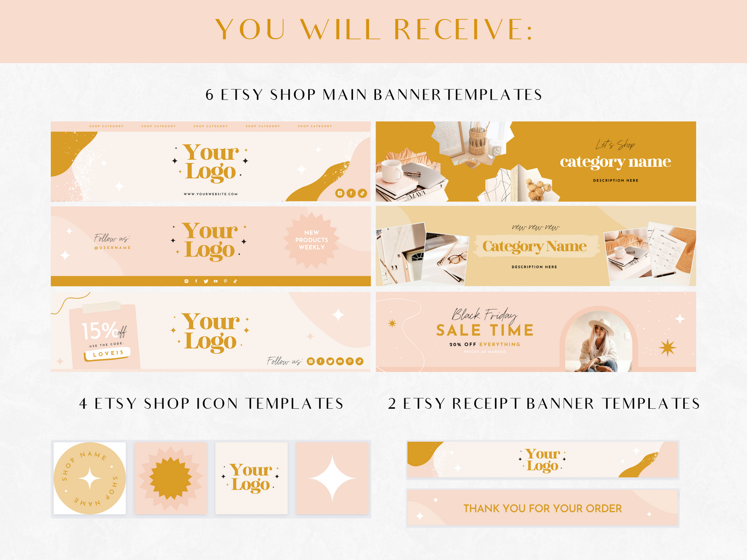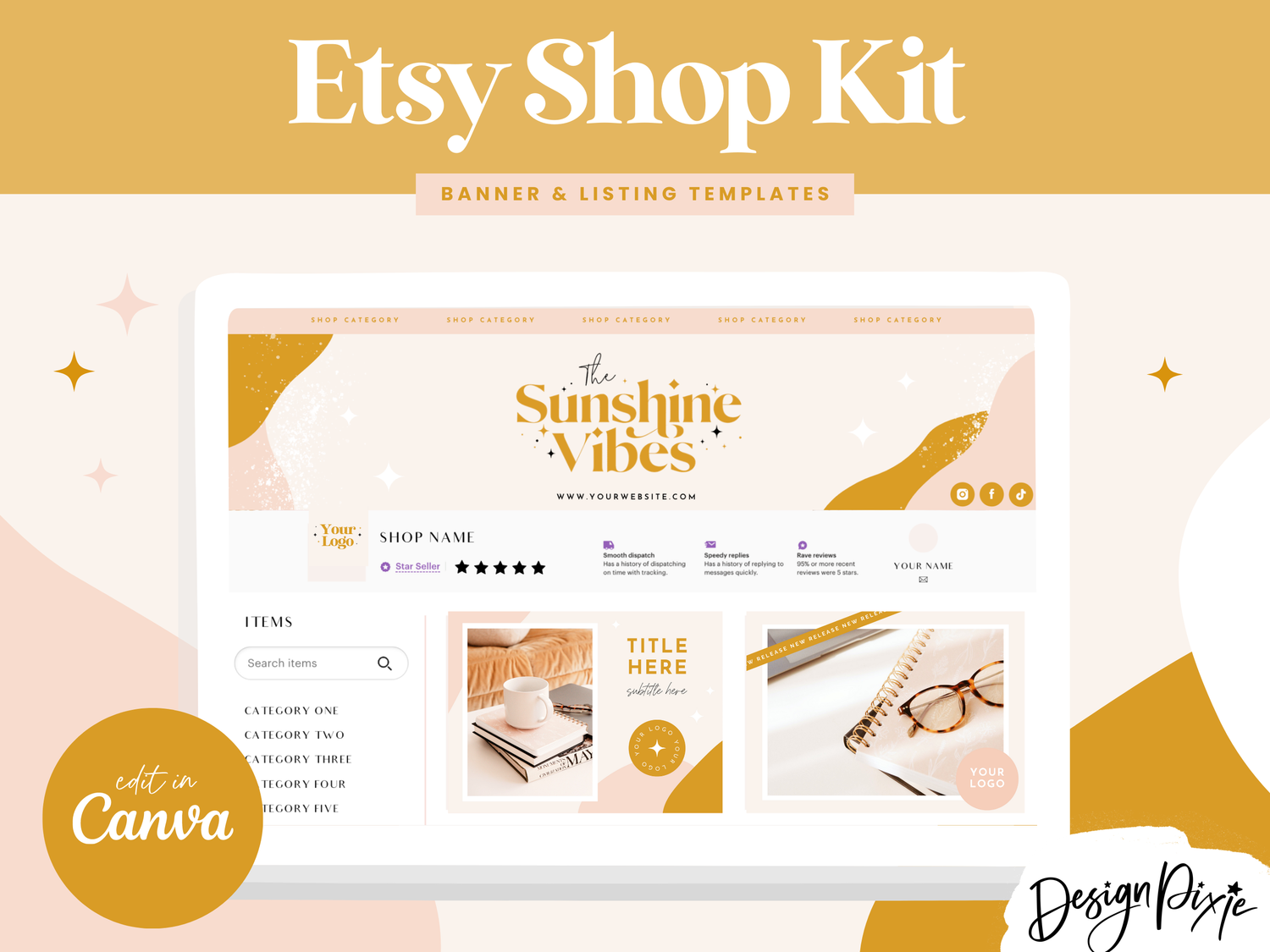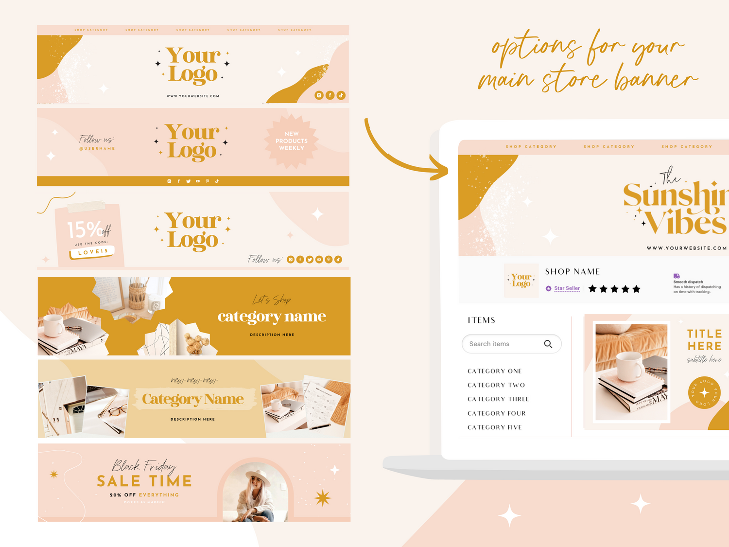 Etsy banner shop kit to edit in Canva in a bright, boho style as part of the Sunshine Vibes collection. Style your Etsy store with beautiful banner templates and designs for your product listings for ultimate success!