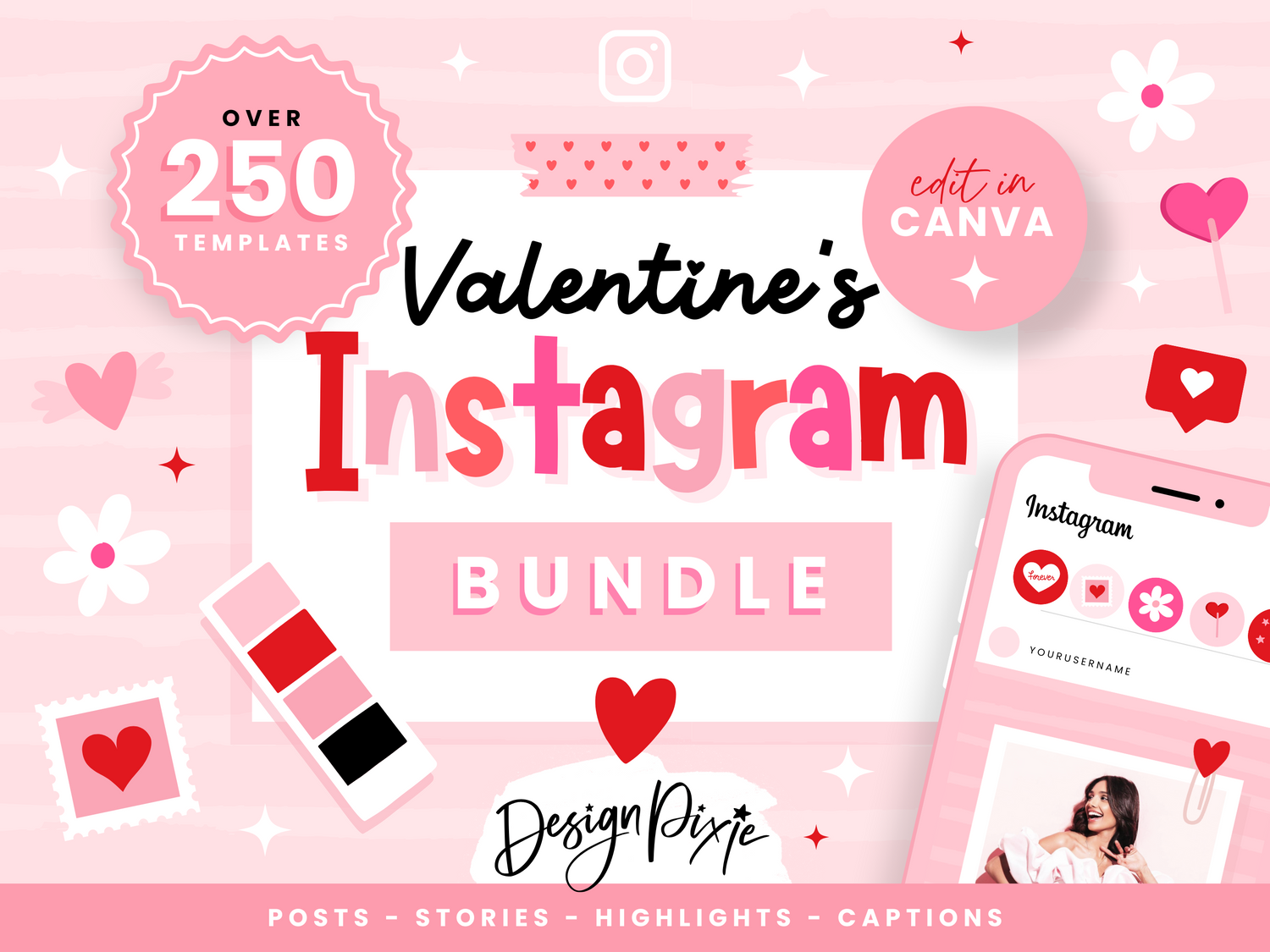 Valentine’s Day Instagram templates to edit in Canva. This Valentine Instagram Bundle is your go-to pack of Instagram templates for the month of love. All your Valentine’s social media content is already done for you. Use the templates as they are or add your own photos, change text, colors, fonts and more.