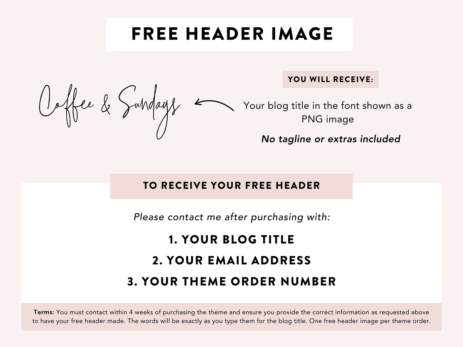 With your one purchase of the Coffee And Sundays theme you can have one header image made. It is simply your blog title in the font shown on the template, on a transparent background. No tagline, no extras and no revisions included.
