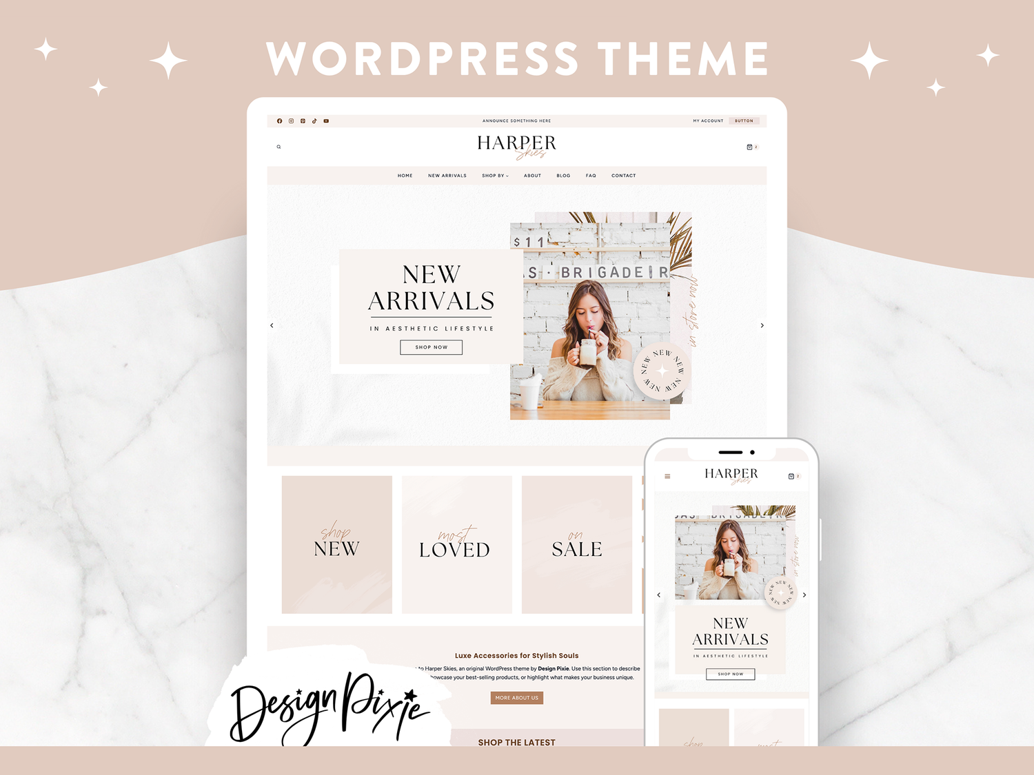 Meet Harper Skies, a modern WordPress theme designed for creators who love calm, airy spaces and neutral tones. Clean white and soft beige create a luxe, editorial feel, while the typography keeps everything looking polished and professional.