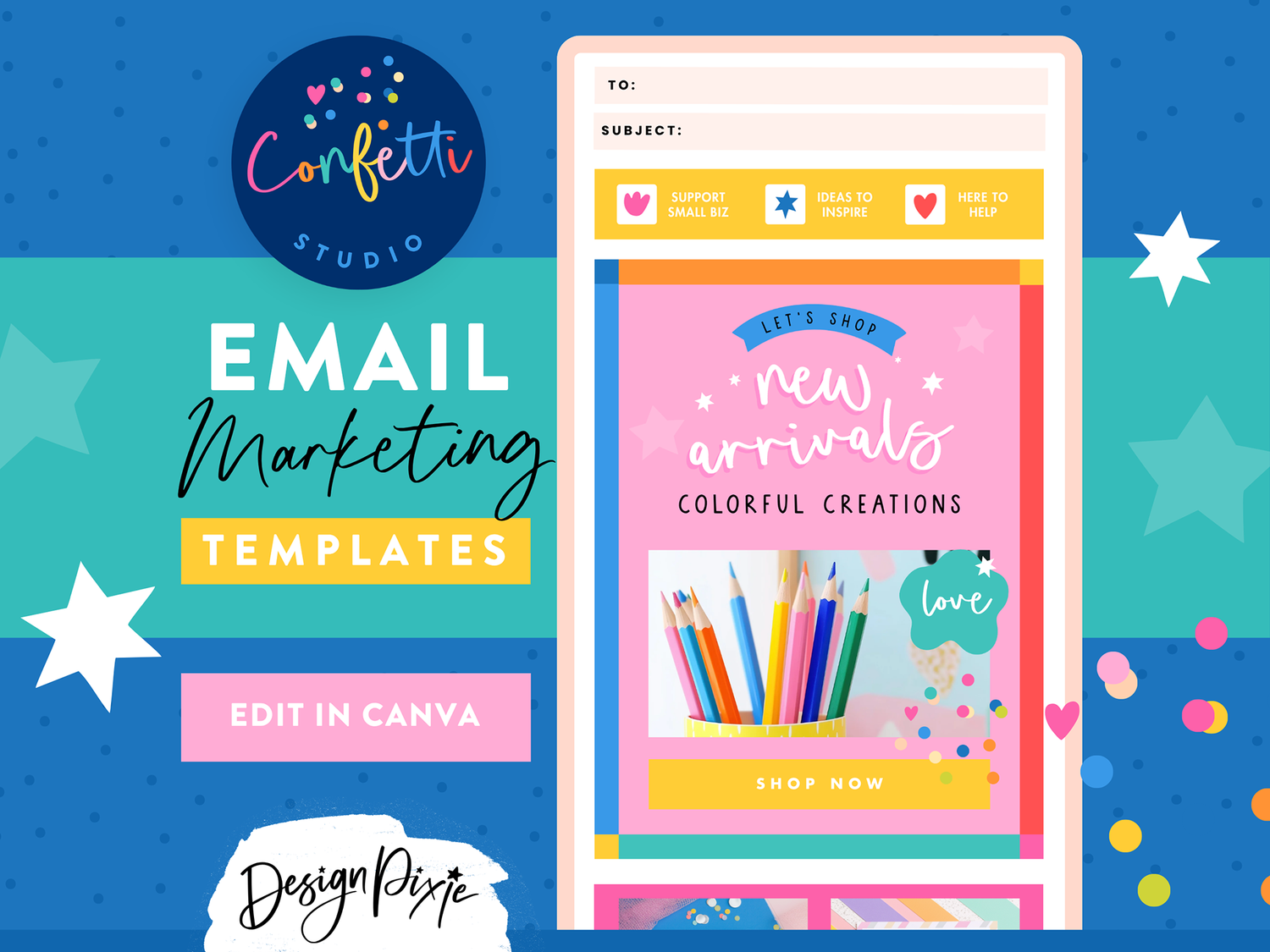 Perfect for printable shops, creatives, educators, party planners, digital product sellers, and colorful brands, the Confetti pack helps you create email content that looks fun, feels professional, and totally reflects your vibe.