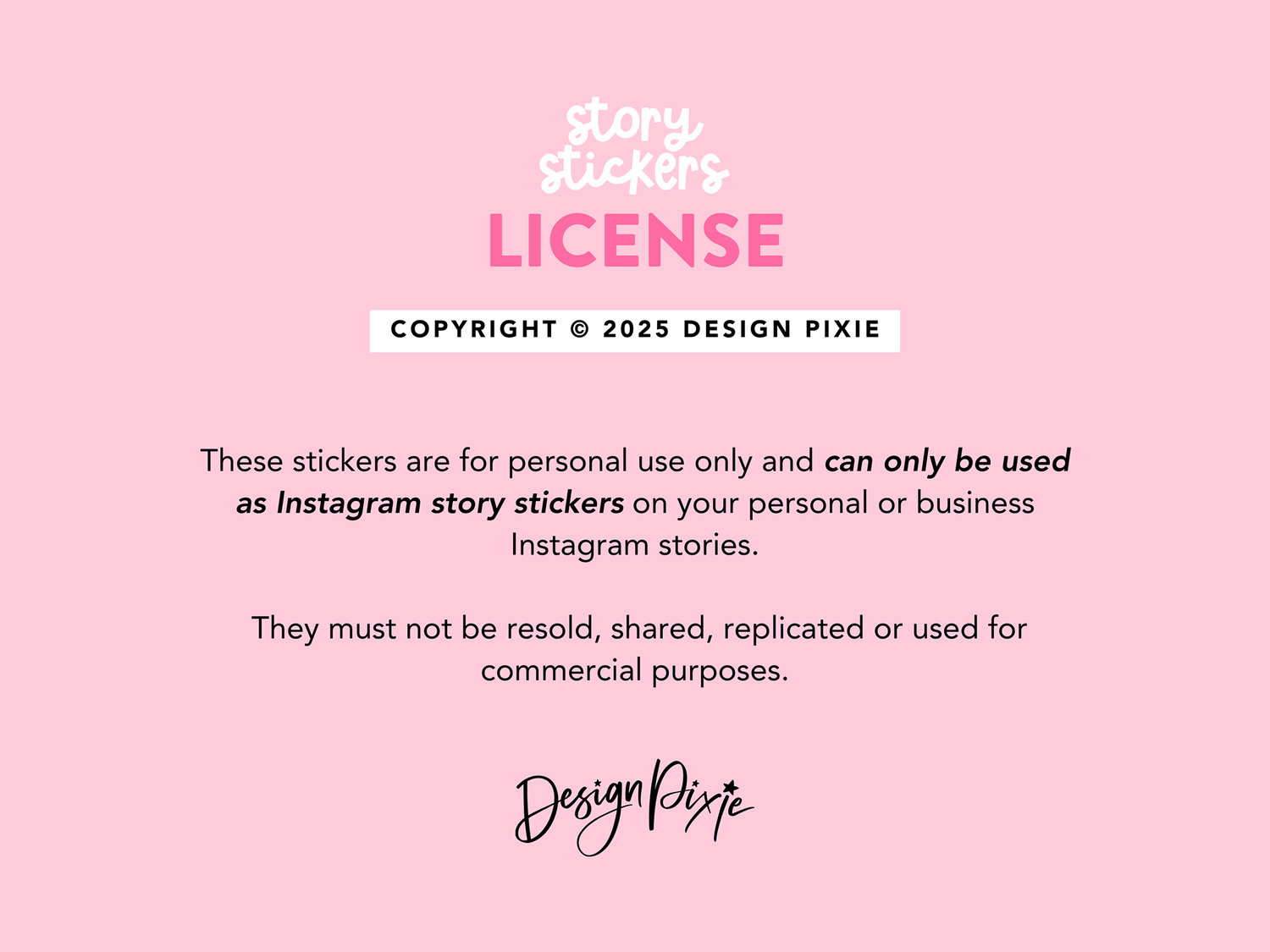 These stickers are for personal use only. You can use them on your own Instagram account (personal or business), but re-selling, sharing, or using them commercially is not allowed.