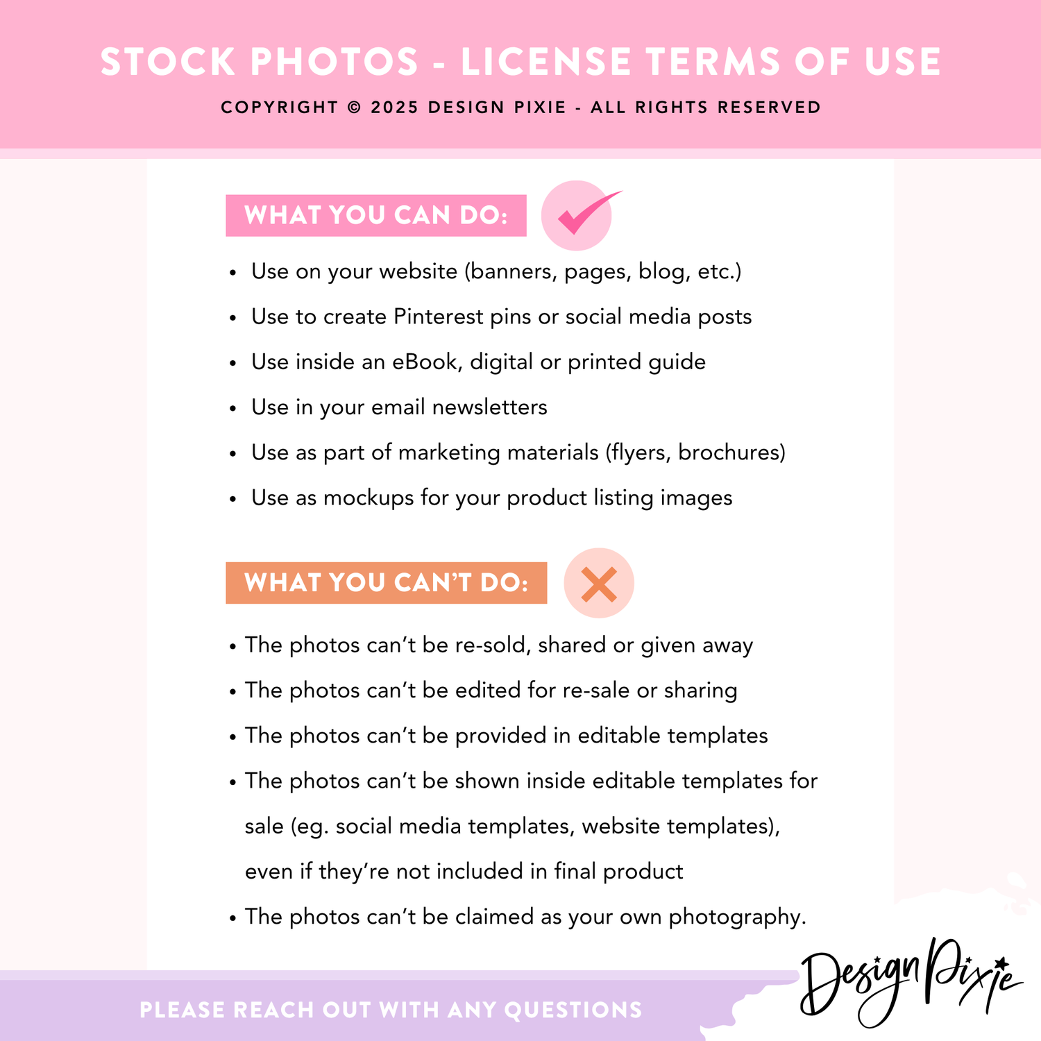 One purchase of this product allows you to use the photos for your own business branding, marketing, website and blog: